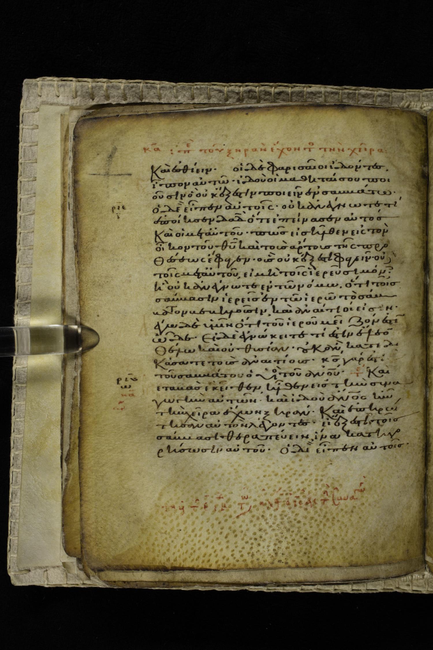 Eleventh century minuscule of the Gospels on parchment; 262 leaves, single column, 22-23 lines per column. Images were taken at the Hellenic Parliament Library in Athens.