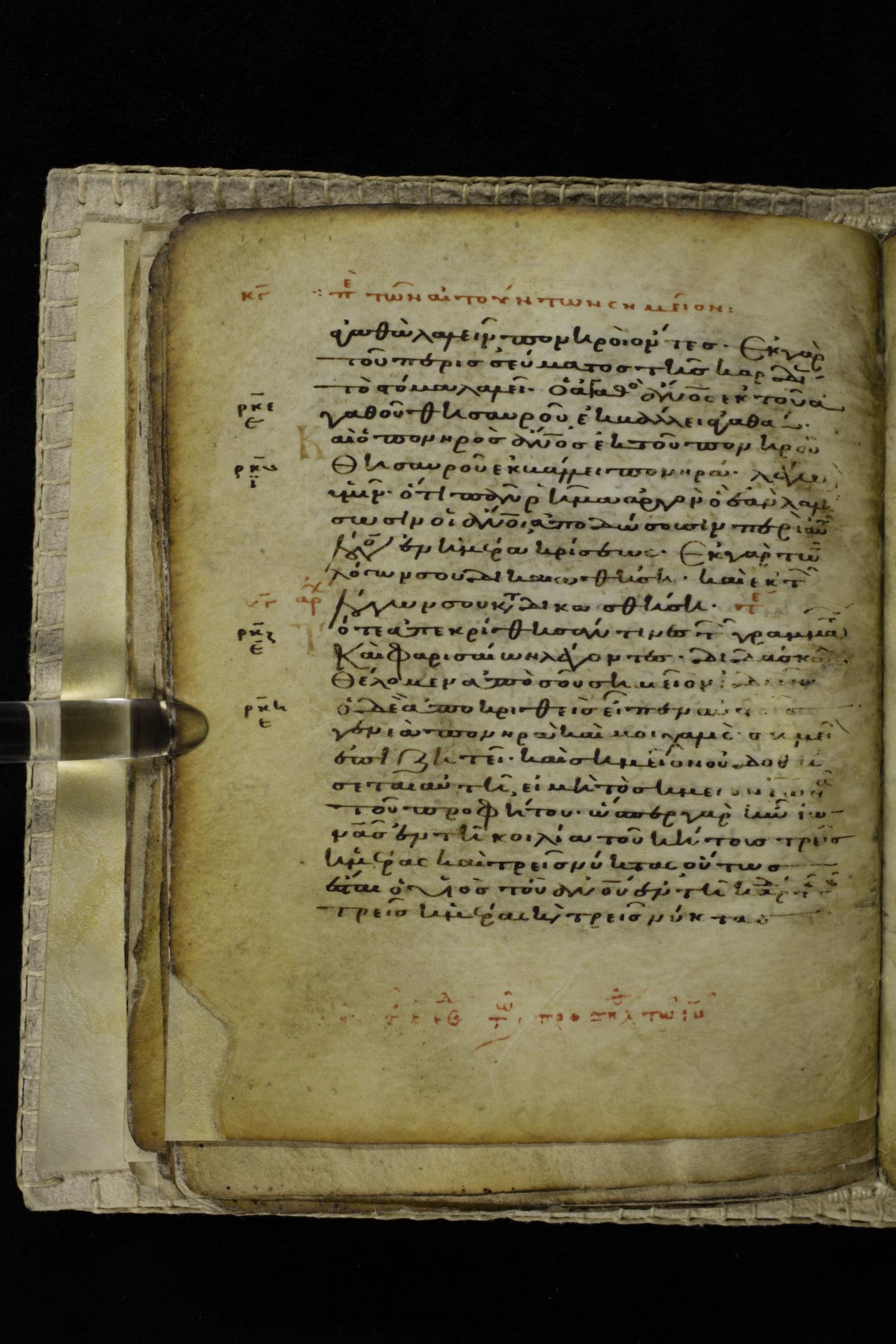Eleventh century minuscule of the Gospels on parchment; 262 leaves, single column, 22-23 lines per column. Images were taken at the Hellenic Parliament Library in Athens.