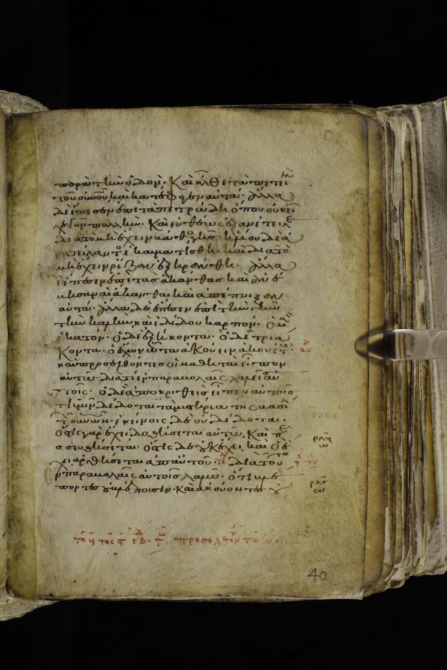 Eleventh century minuscule of the Gospels on parchment; 262 leaves, single column, 22-23 lines per column. Images were taken at the Hellenic Parliament Library in Athens.