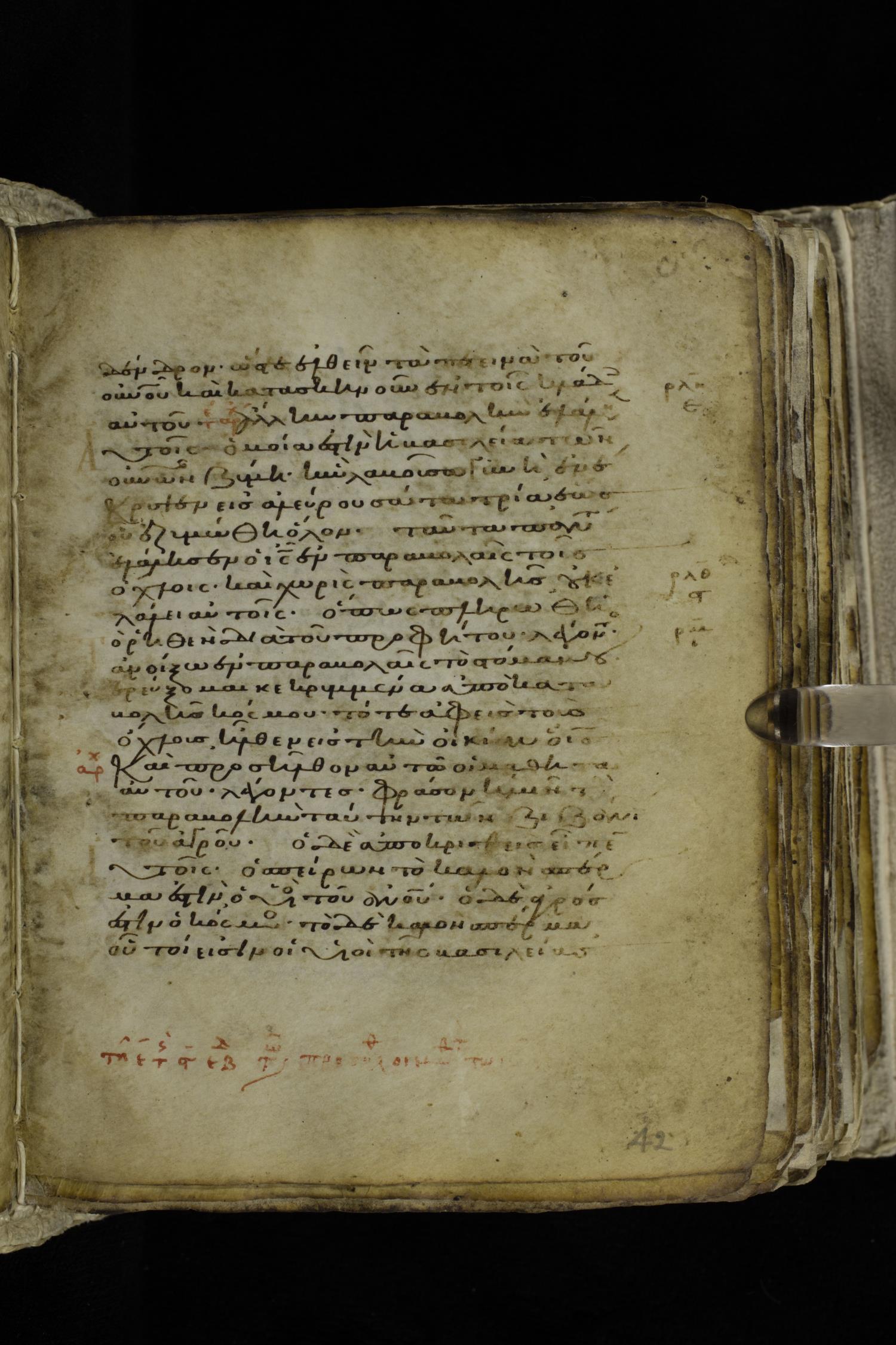 Eleventh century minuscule of the Gospels on parchment; 262 leaves, single column, 22-23 lines per column. Images were taken at the Hellenic Parliament Library in Athens.