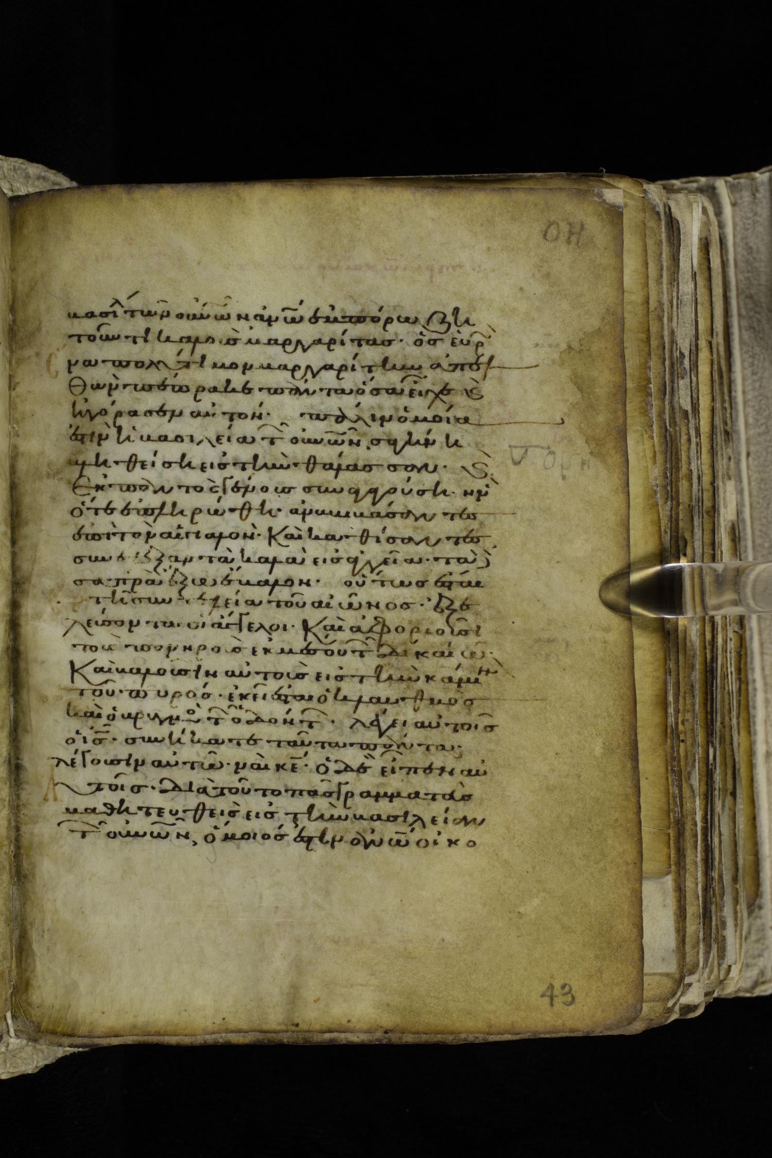 Eleventh century minuscule of the Gospels on parchment; 262 leaves, single column, 22-23 lines per column. Images were taken at the Hellenic Parliament Library in Athens.