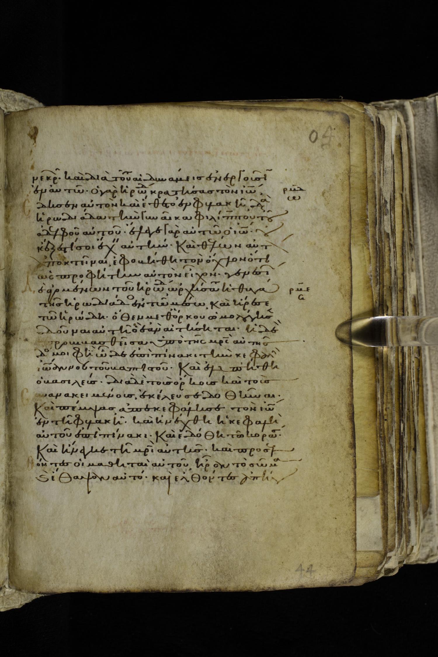 Eleventh century minuscule of the Gospels on parchment; 262 leaves, single column, 22-23 lines per column. Images were taken at the Hellenic Parliament Library in Athens.