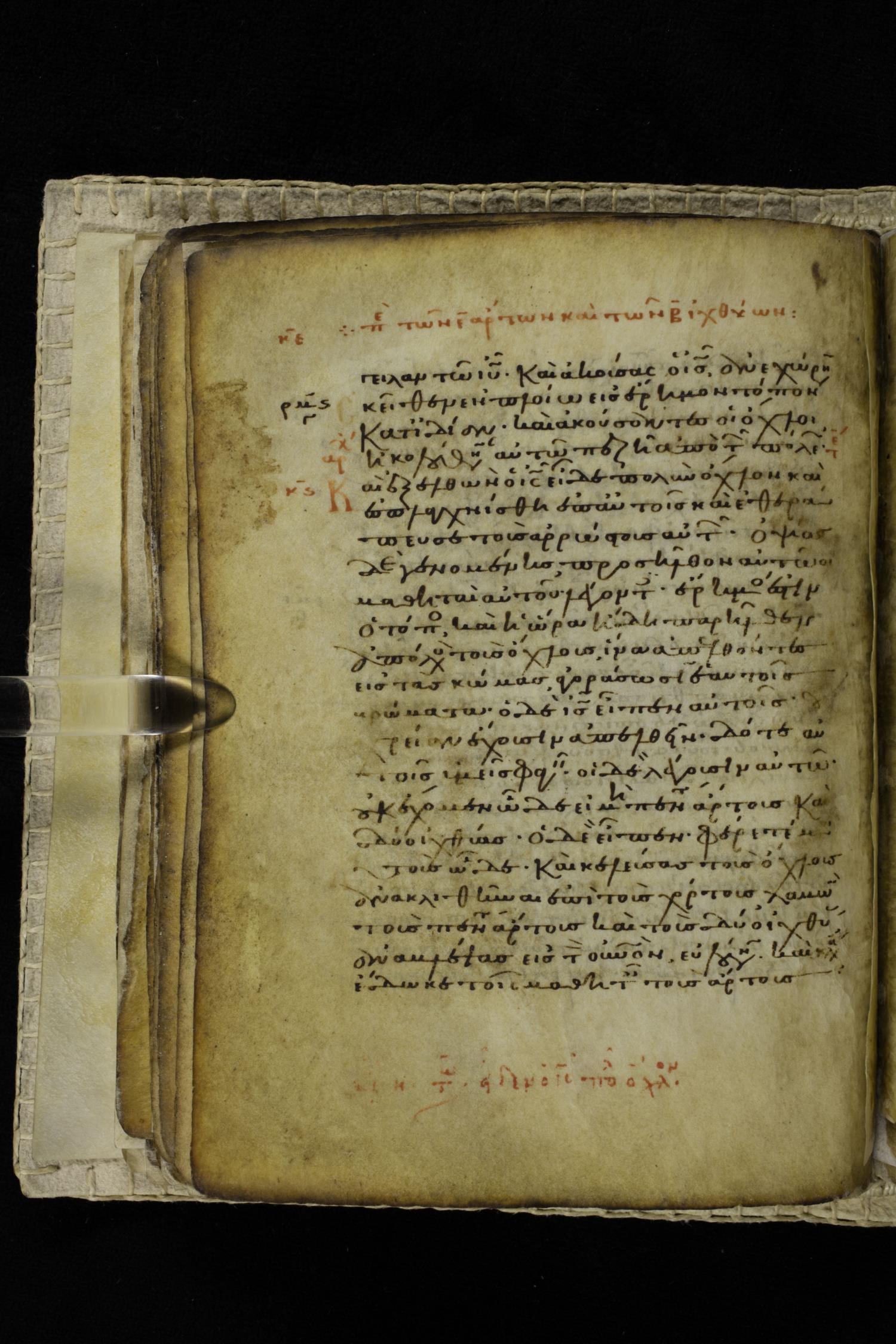Eleventh century minuscule of the Gospels on parchment; 262 leaves, single column, 22-23 lines per column. Images were taken at the Hellenic Parliament Library in Athens.