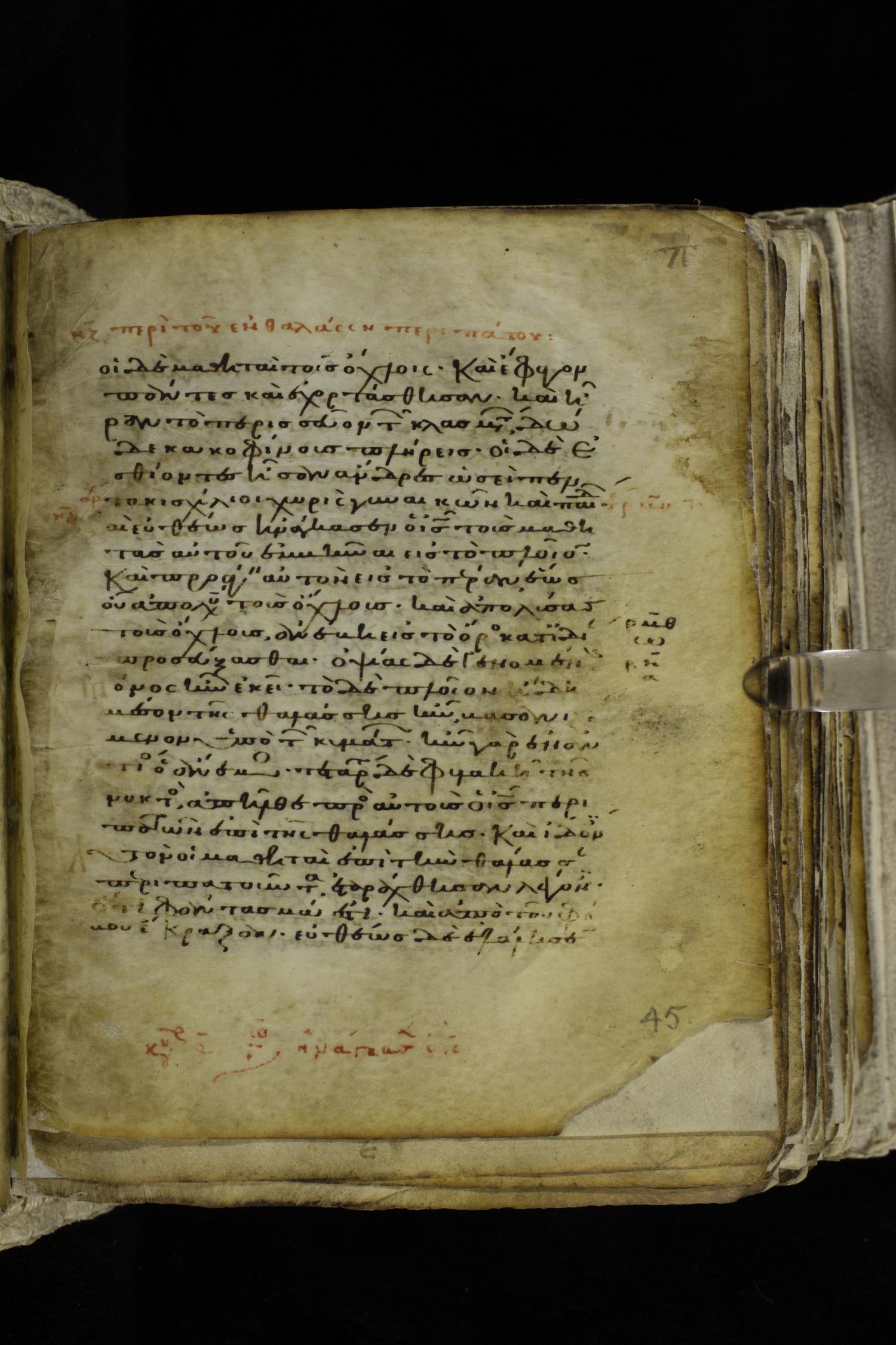 Eleventh century minuscule of the Gospels on parchment; 262 leaves, single column, 22-23 lines per column. Images were taken at the Hellenic Parliament Library in Athens.