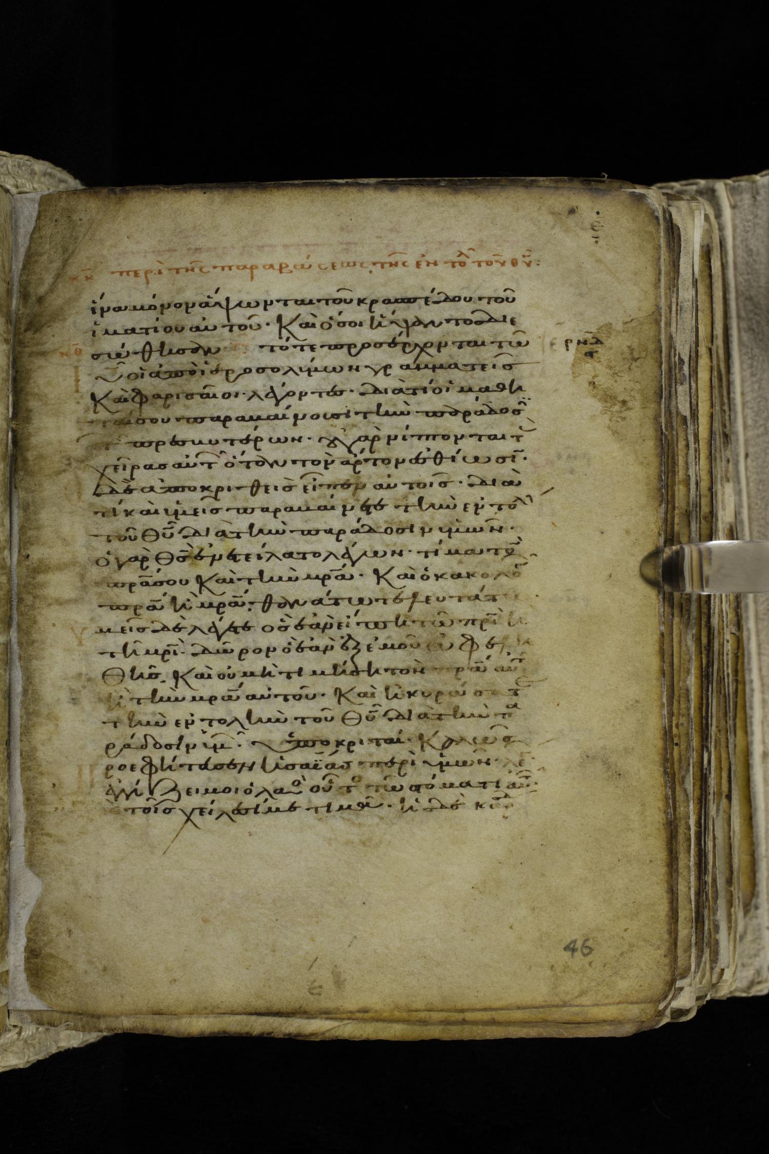 Eleventh century minuscule of the Gospels on parchment; 262 leaves, single column, 22-23 lines per column. Images were taken at the Hellenic Parliament Library in Athens.