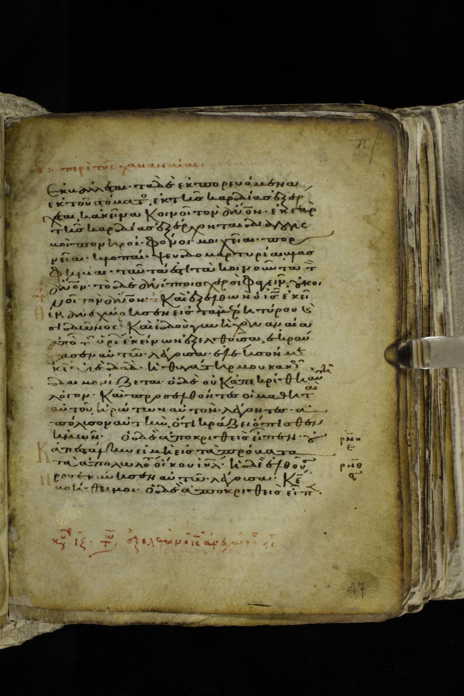 Eleventh century minuscule of the Gospels on parchment; 262 leaves, single column, 22-23 lines per column. Images were taken at the Hellenic Parliament Library in Athens.