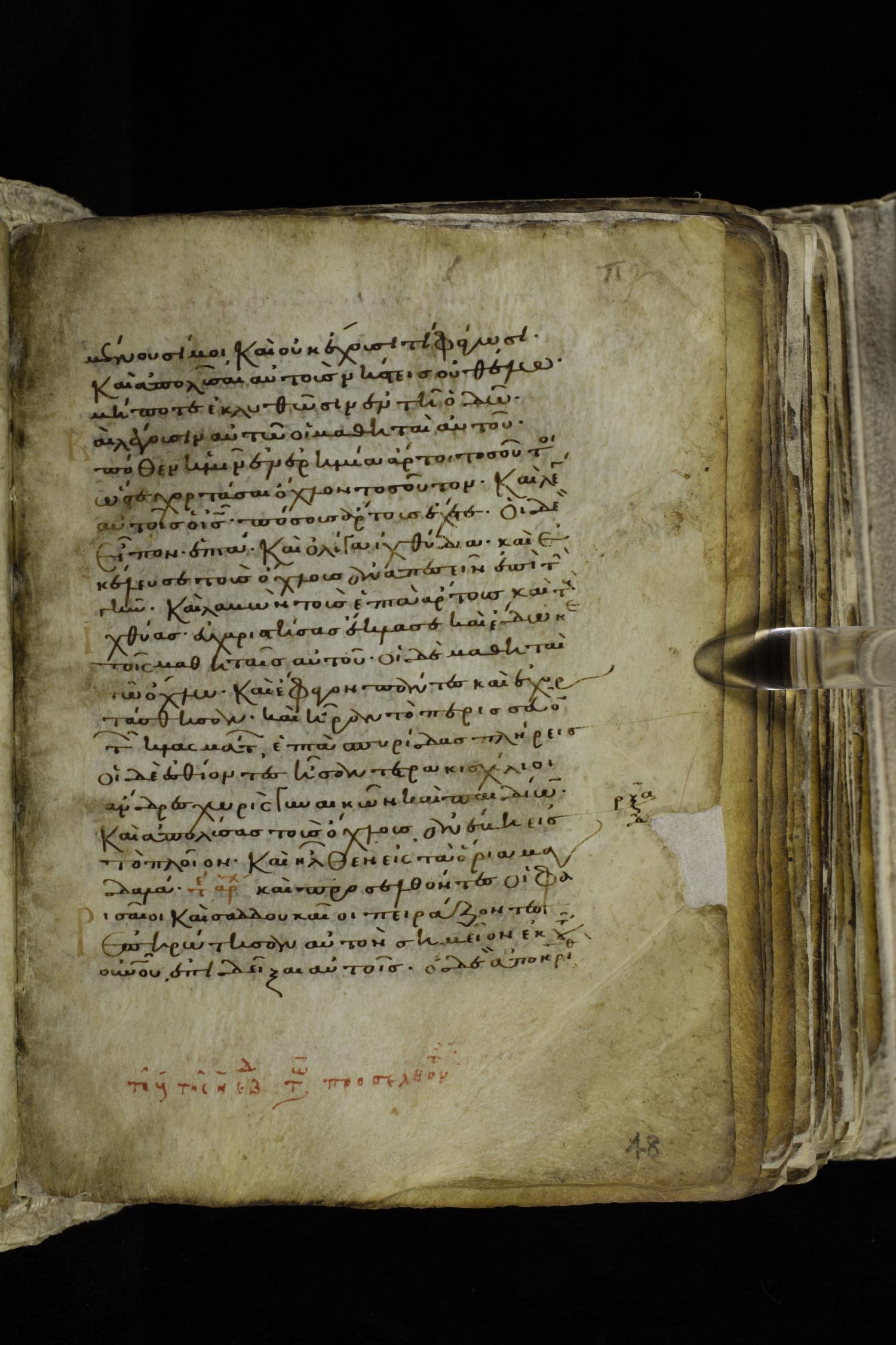 Eleventh century minuscule of the Gospels on parchment; 262 leaves, single column, 22-23 lines per column. Images were taken at the Hellenic Parliament Library in Athens.