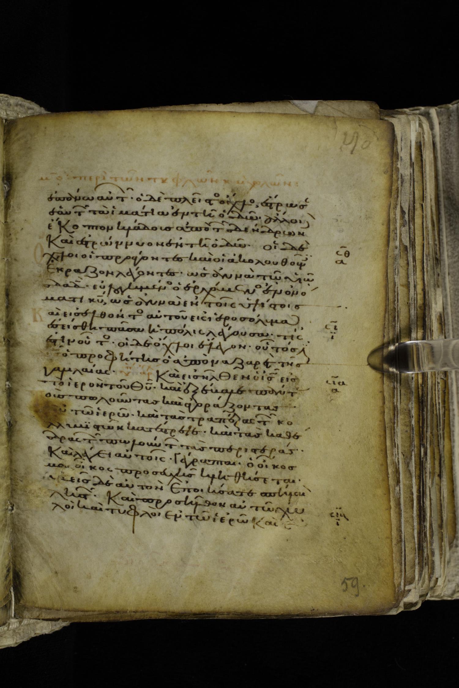 Eleventh century minuscule of the Gospels on parchment; 262 leaves, single column, 22-23 lines per column. Images were taken at the Hellenic Parliament Library in Athens.