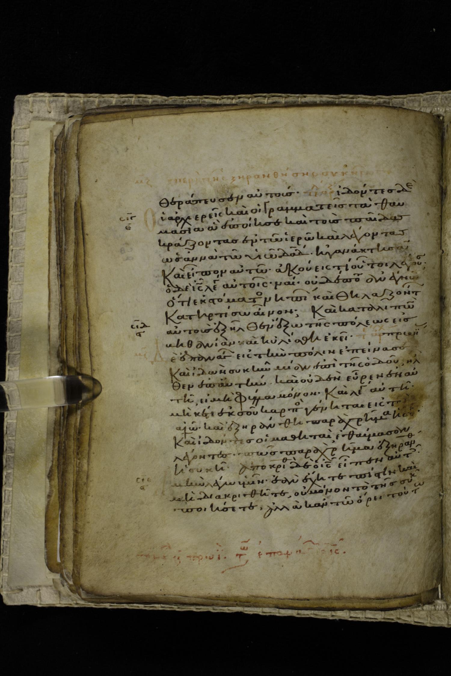 Eleventh century minuscule of the Gospels on parchment; 262 leaves, single column, 22-23 lines per column. Images were taken at the Hellenic Parliament Library in Athens.