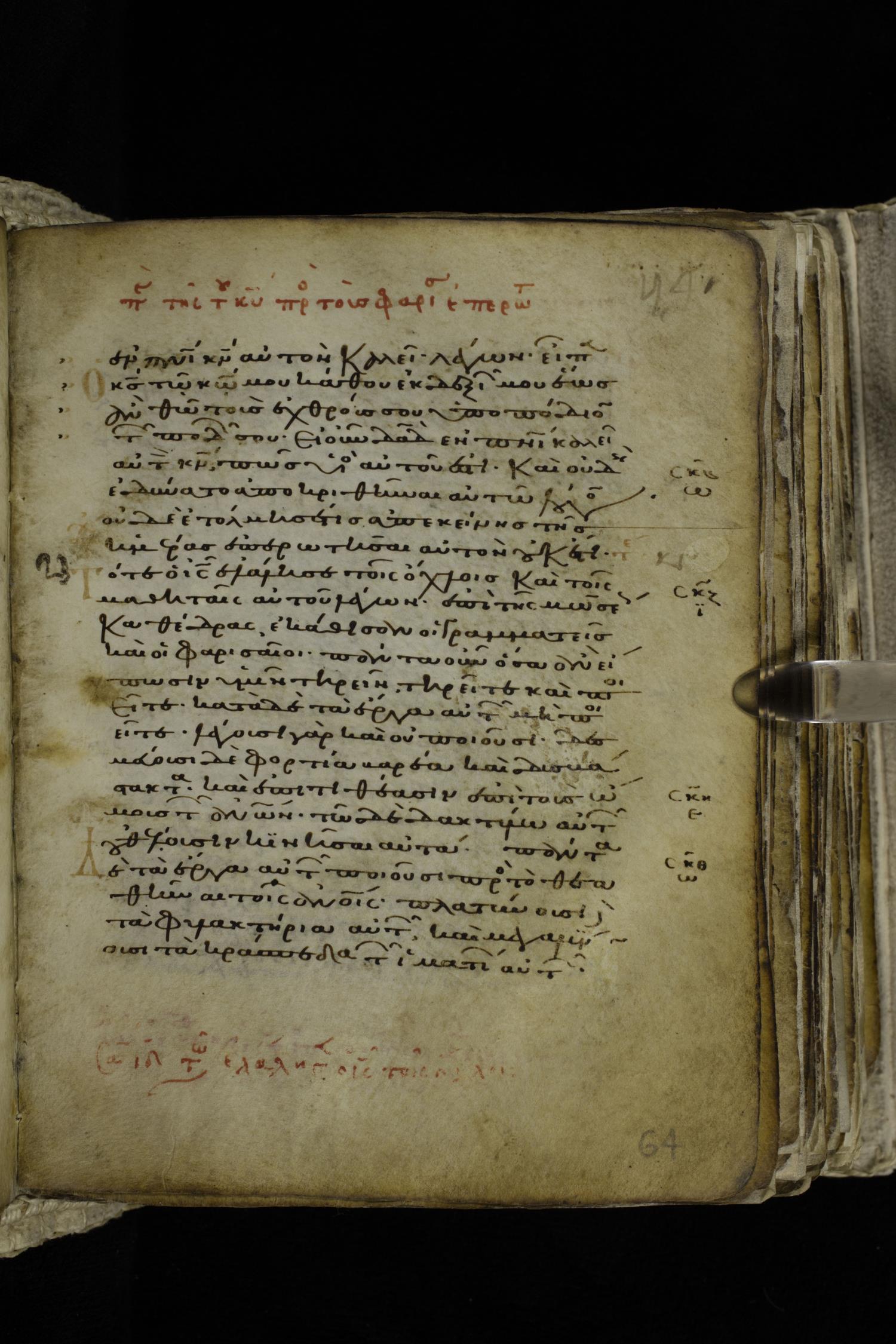 Eleventh century minuscule of the Gospels on parchment; 262 leaves, single column, 22-23 lines per column. Images were taken at the Hellenic Parliament Library in Athens.