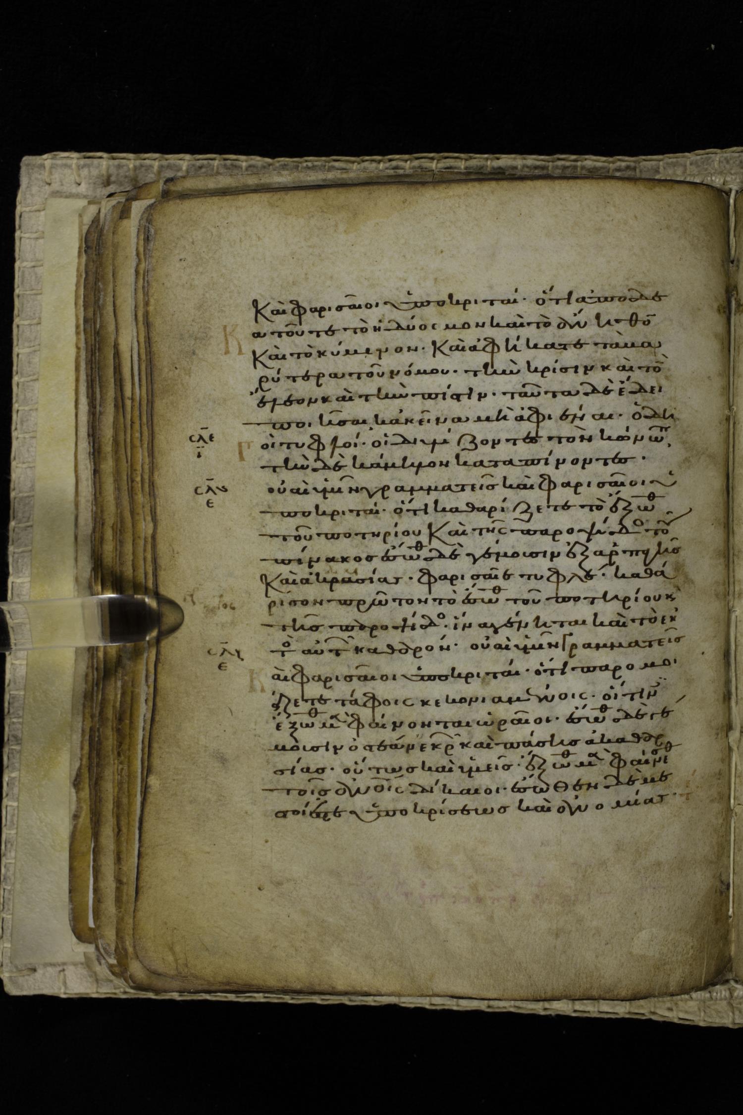 Eleventh century minuscule of the Gospels on parchment; 262 leaves, single column, 22-23 lines per column. Images were taken at the Hellenic Parliament Library in Athens.