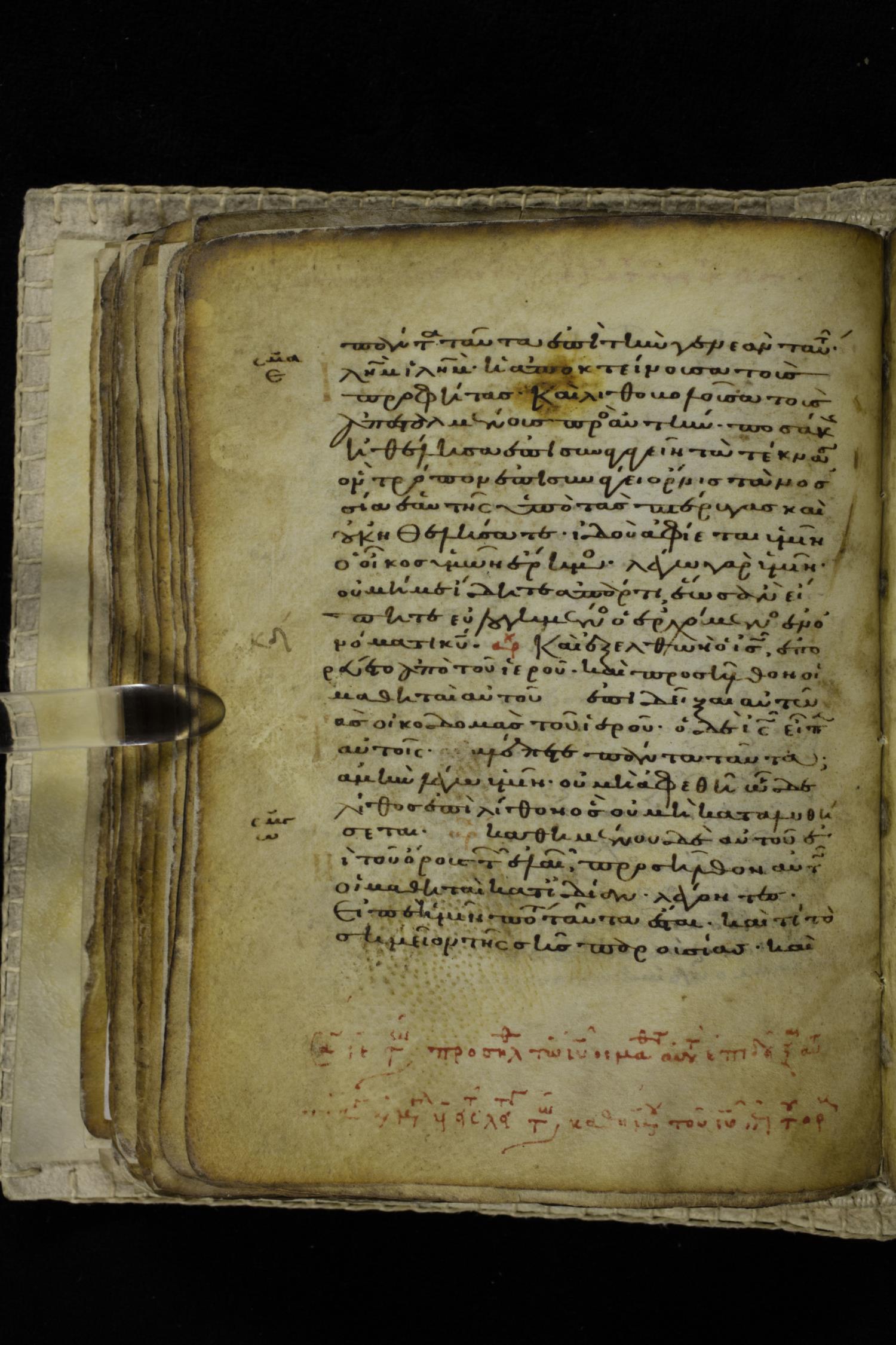 Eleventh century minuscule of the Gospels on parchment; 262 leaves, single column, 22-23 lines per column. Images were taken at the Hellenic Parliament Library in Athens.