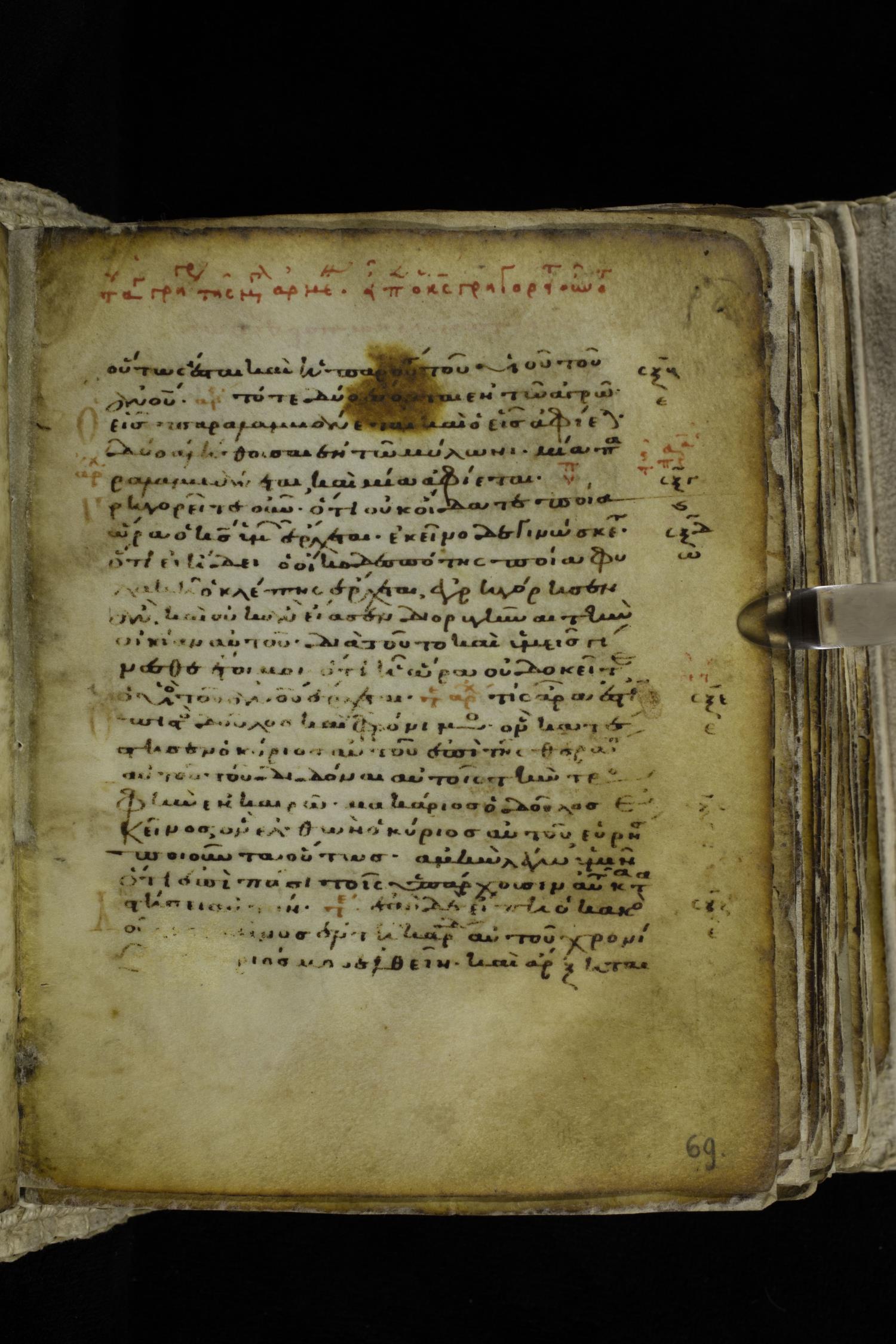 Eleventh century minuscule of the Gospels on parchment; 262 leaves, single column, 22-23 lines per column. Images were taken at the Hellenic Parliament Library in Athens.