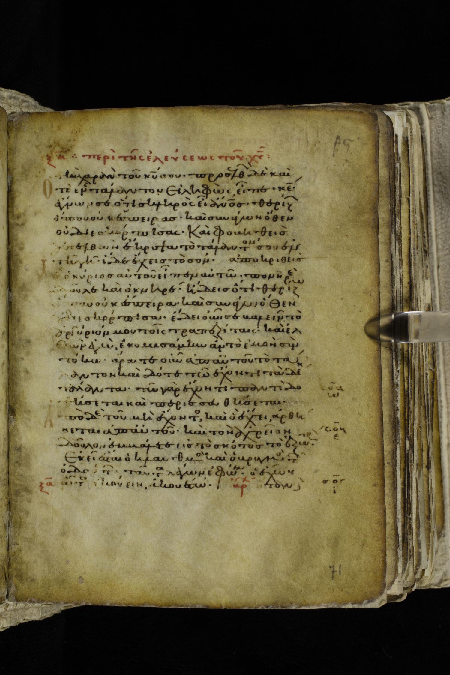 Eleventh century minuscule of the Gospels on parchment; 262 leaves, single column, 22-23 lines per column. Images were taken at the Hellenic Parliament Library in Athens.