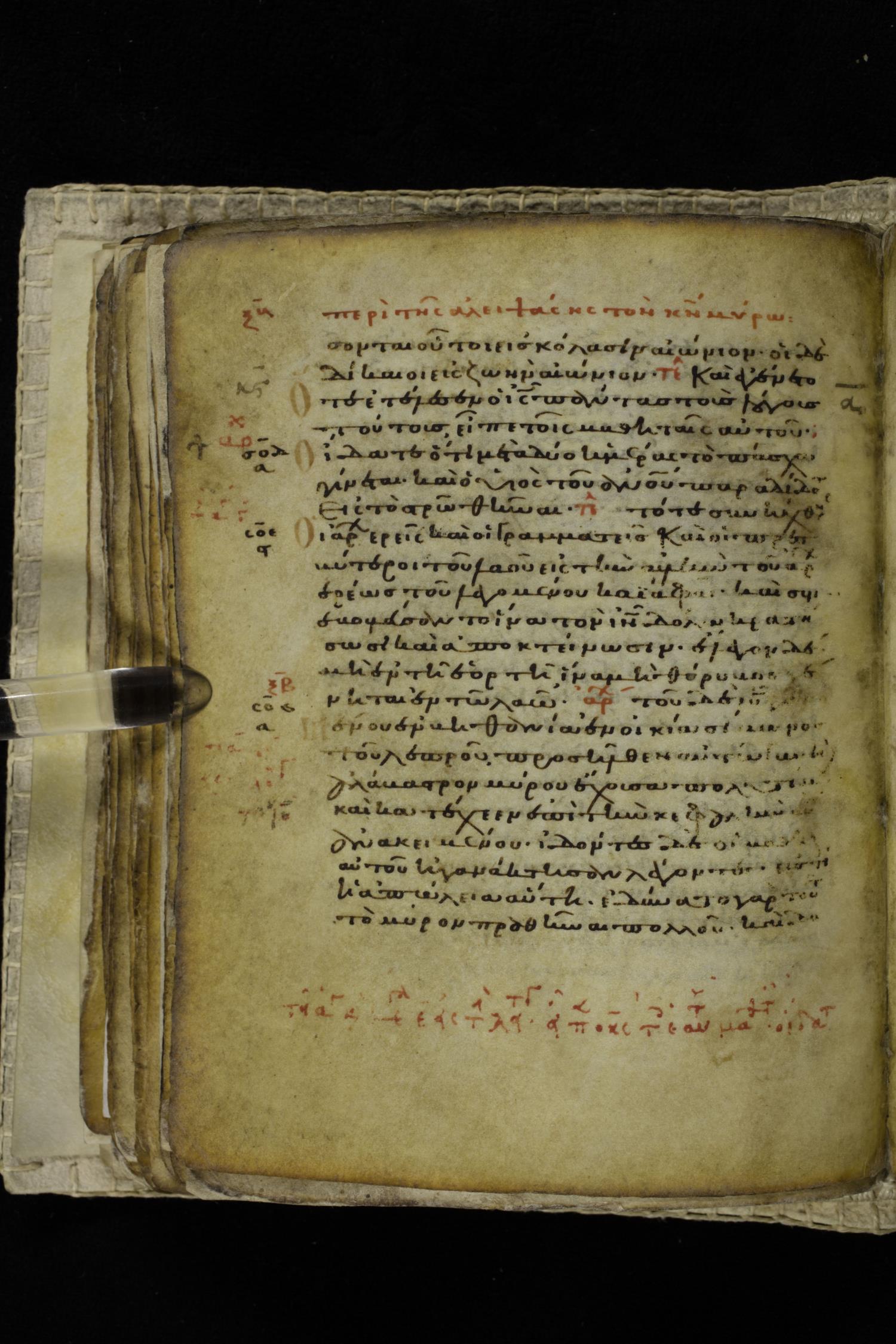 Eleventh century minuscule of the Gospels on parchment; 262 leaves, single column, 22-23 lines per column. Images were taken at the Hellenic Parliament Library in Athens.