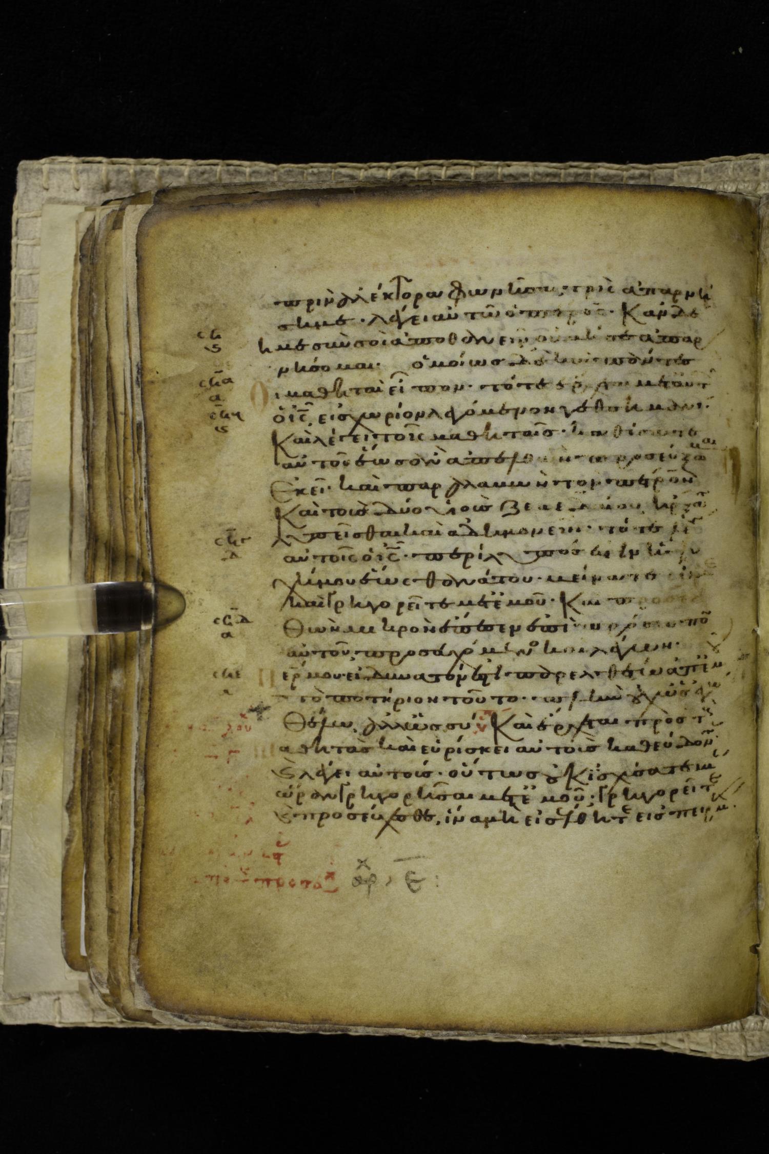 Eleventh century minuscule of the Gospels on parchment; 262 leaves, single column, 22-23 lines per column. Images were taken at the Hellenic Parliament Library in Athens.