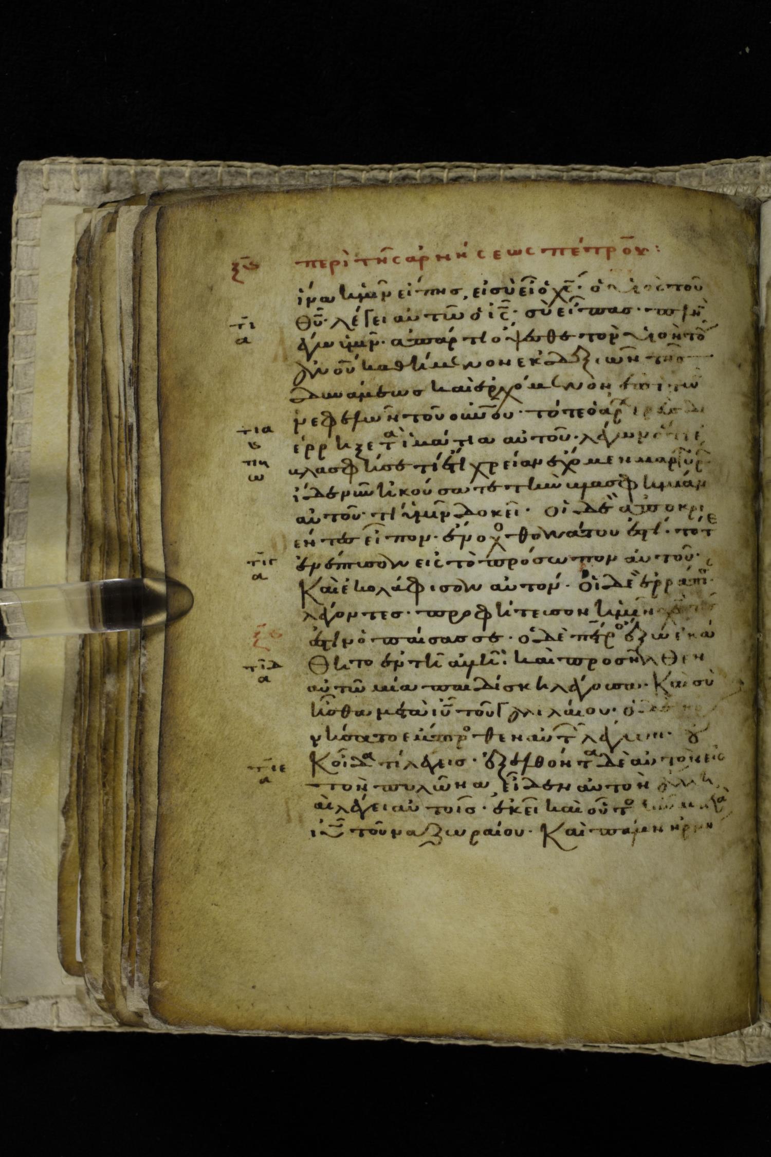 Eleventh century minuscule of the Gospels on parchment; 262 leaves, single column, 22-23 lines per column. Images were taken at the Hellenic Parliament Library in Athens.