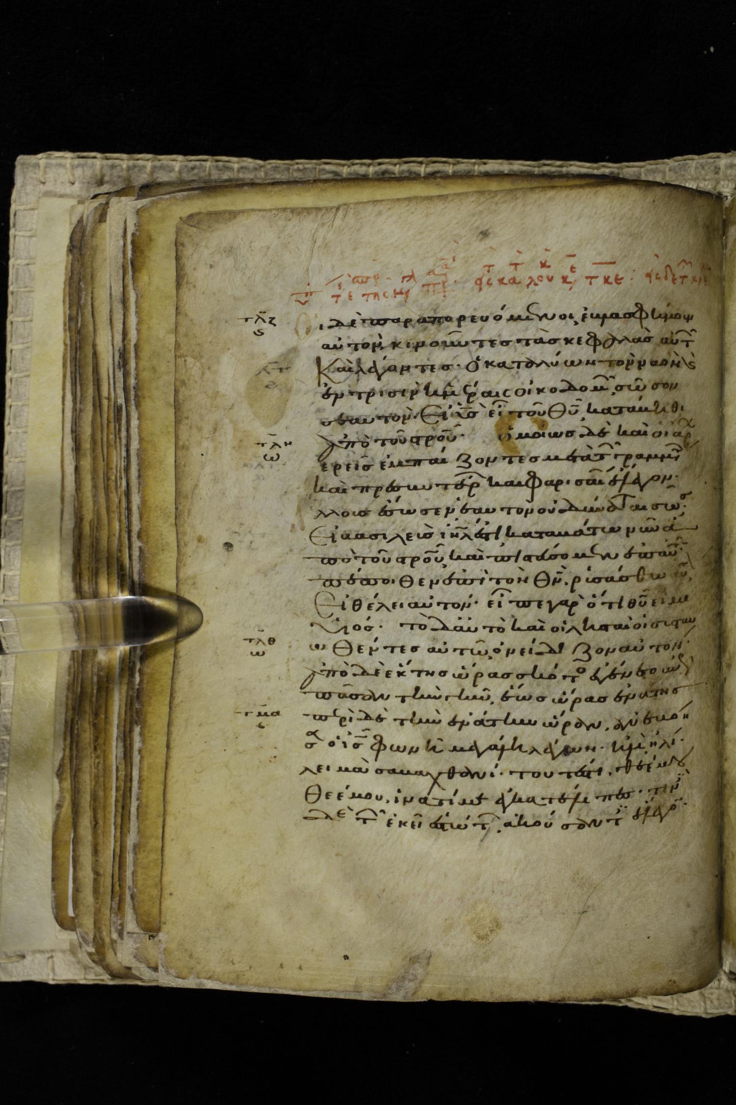 Eleventh century minuscule of the Gospels on parchment; 262 leaves, single column, 22-23 lines per column. Images were taken at the Hellenic Parliament Library in Athens.