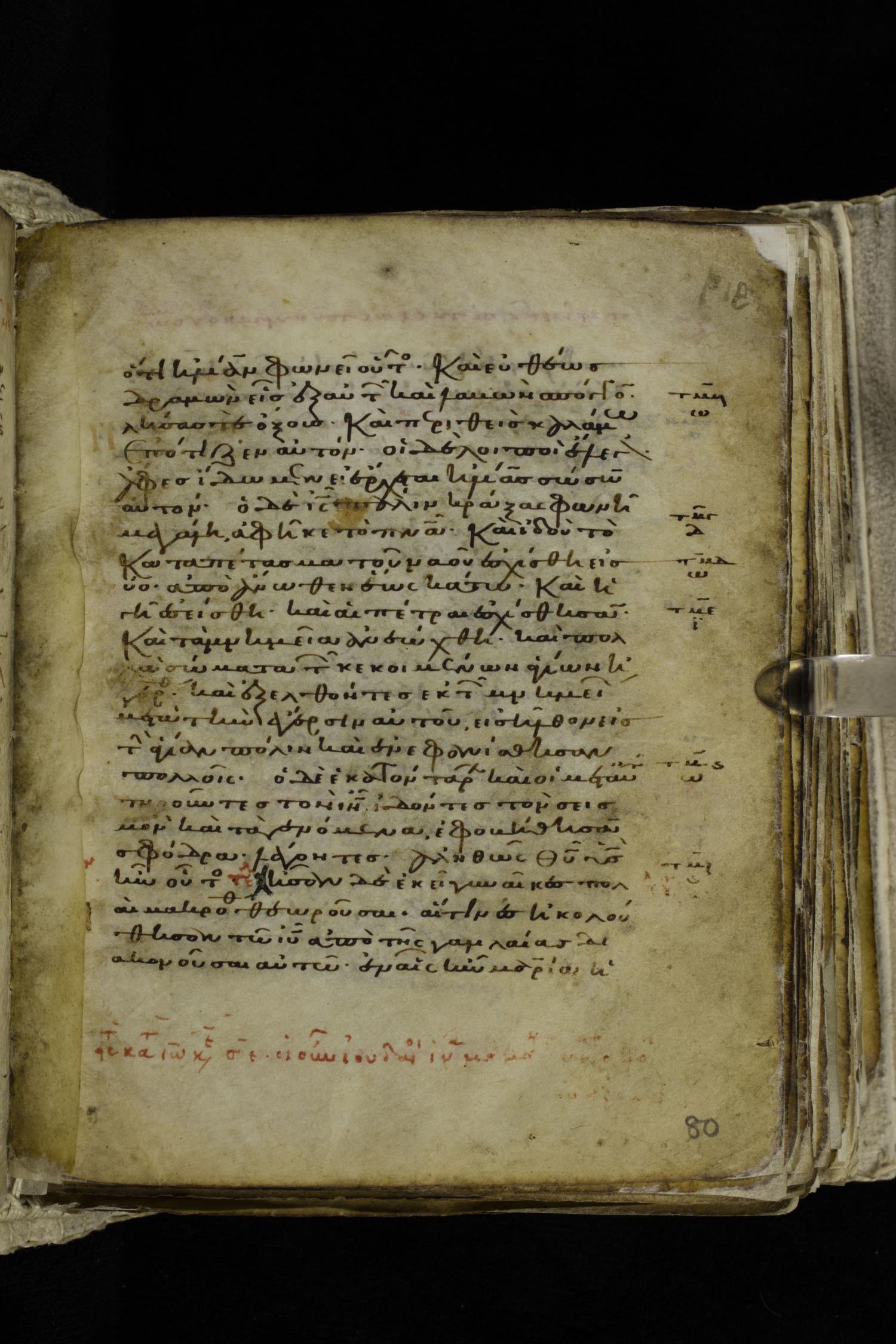 Eleventh century minuscule of the Gospels on parchment; 262 leaves, single column, 22-23 lines per column. Images were taken at the Hellenic Parliament Library in Athens.