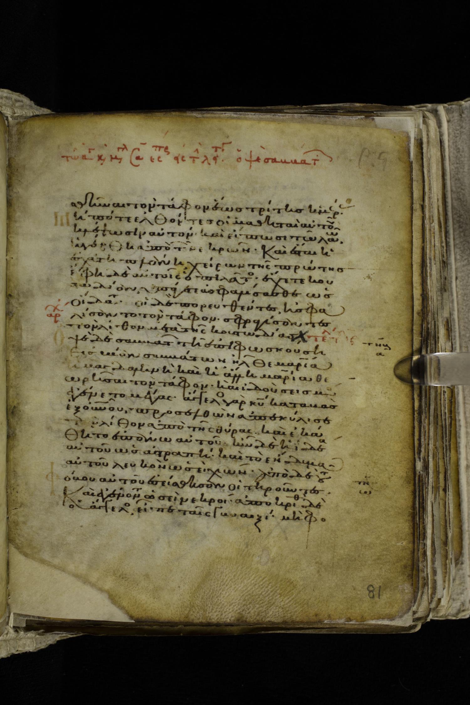 Eleventh century minuscule of the Gospels on parchment; 262 leaves, single column, 22-23 lines per column. Images were taken at the Hellenic Parliament Library in Athens.
