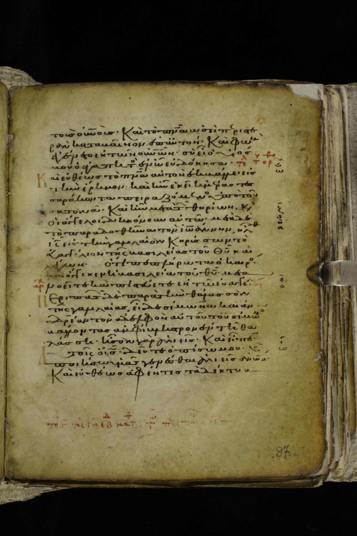 Eleventh century minuscule of the Gospels on parchment; 262 leaves, single column, 22-23 lines per column. Images were taken at the Hellenic Parliament Library in Athens.