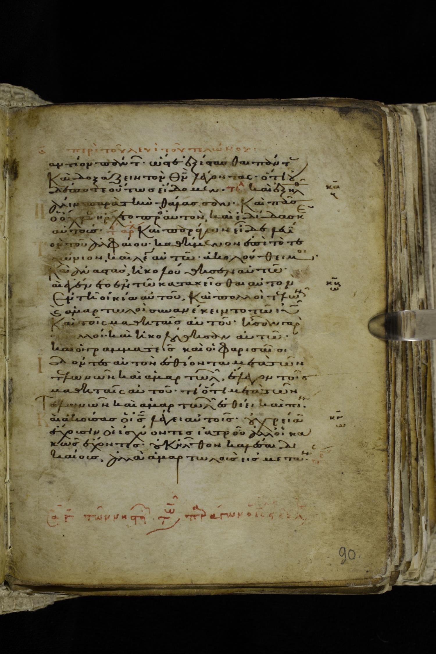 Eleventh century minuscule of the Gospels on parchment; 262 leaves, single column, 22-23 lines per column. Images were taken at the Hellenic Parliament Library in Athens.