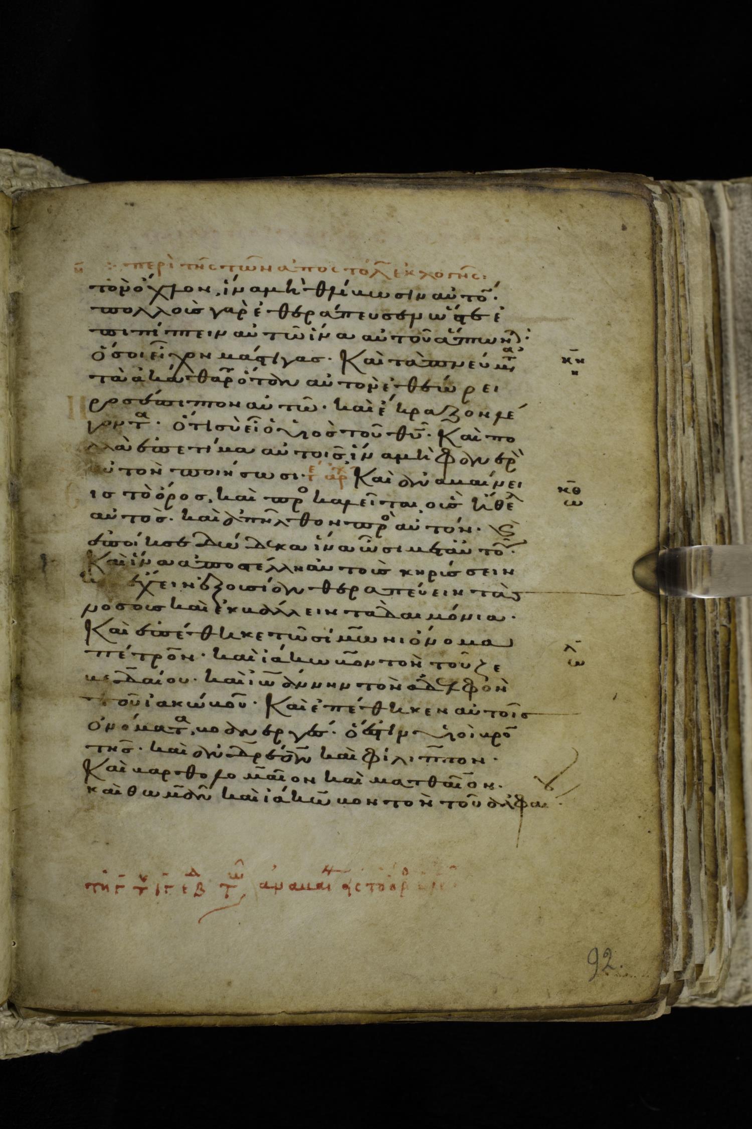 Eleventh century minuscule of the Gospels on parchment; 262 leaves, single column, 22-23 lines per column. Images were taken at the Hellenic Parliament Library in Athens.