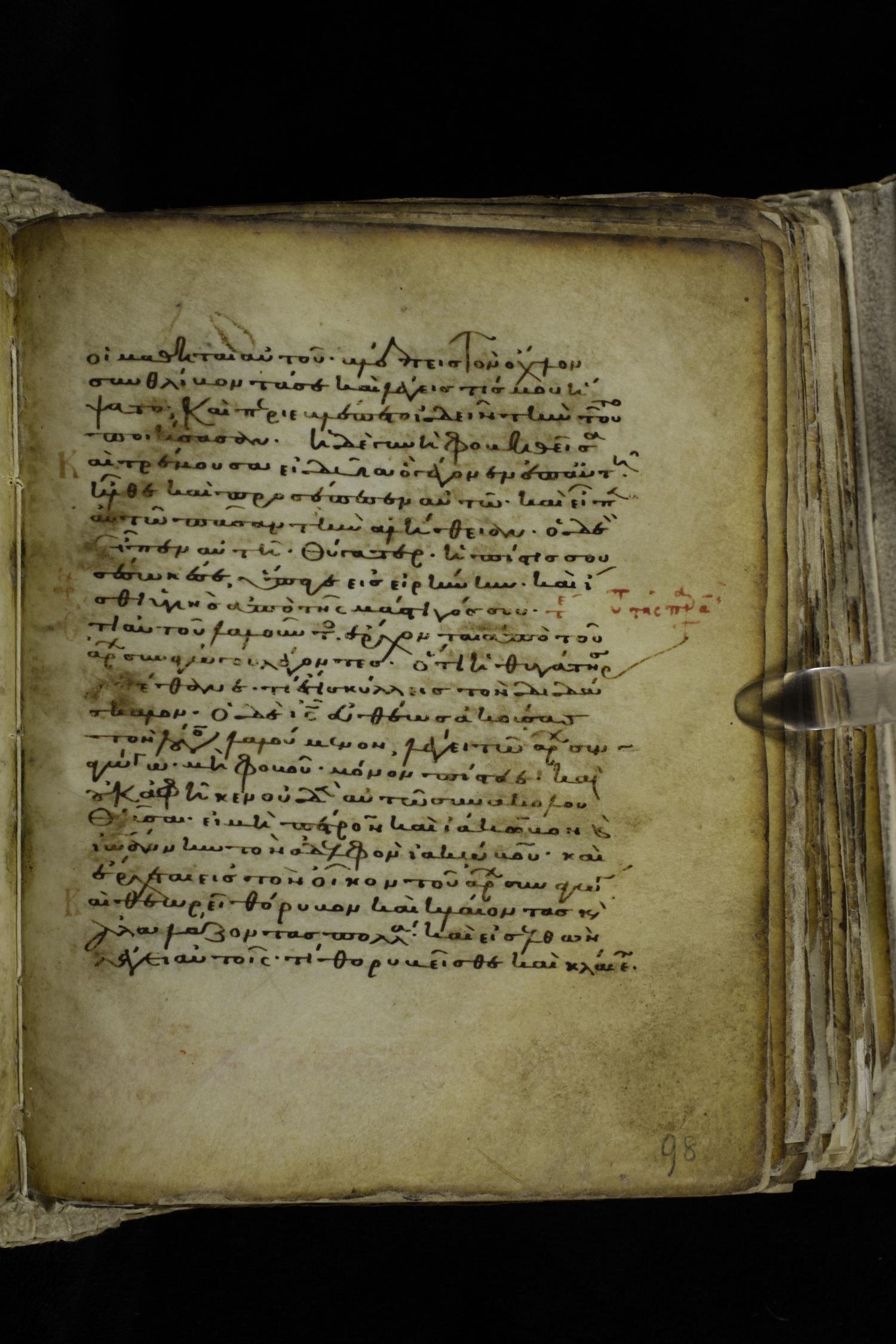 Eleventh century minuscule of the Gospels on parchment; 262 leaves, single column, 22-23 lines per column. Images were taken at the Hellenic Parliament Library in Athens.