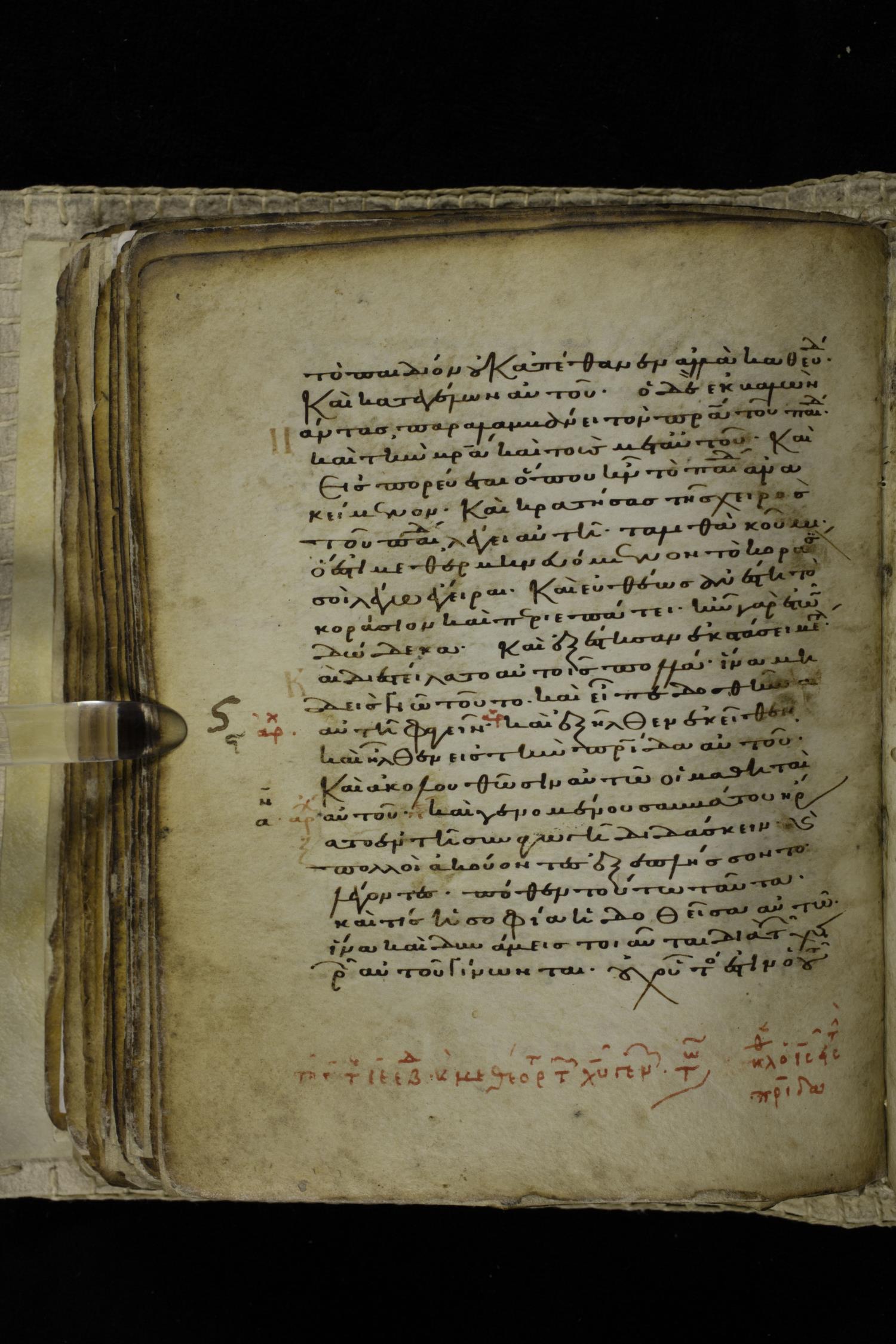 Eleventh century minuscule of the Gospels on parchment; 262 leaves, single column, 22-23 lines per column. Images were taken at the Hellenic Parliament Library in Athens.