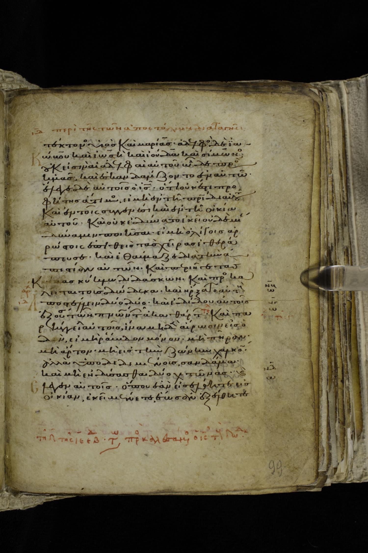 Eleventh century minuscule of the Gospels on parchment; 262 leaves, single column, 22-23 lines per column. Images were taken at the Hellenic Parliament Library in Athens.