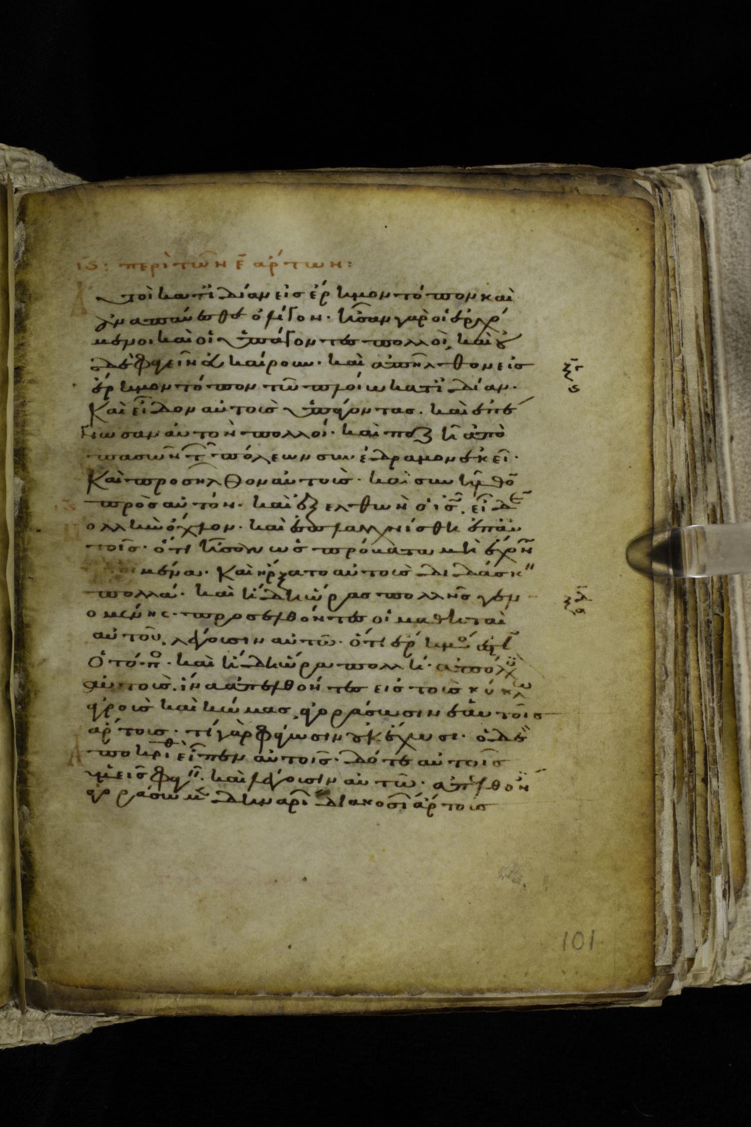 Eleventh century minuscule of the Gospels on parchment; 262 leaves, single column, 22-23 lines per column. Images were taken at the Hellenic Parliament Library in Athens.