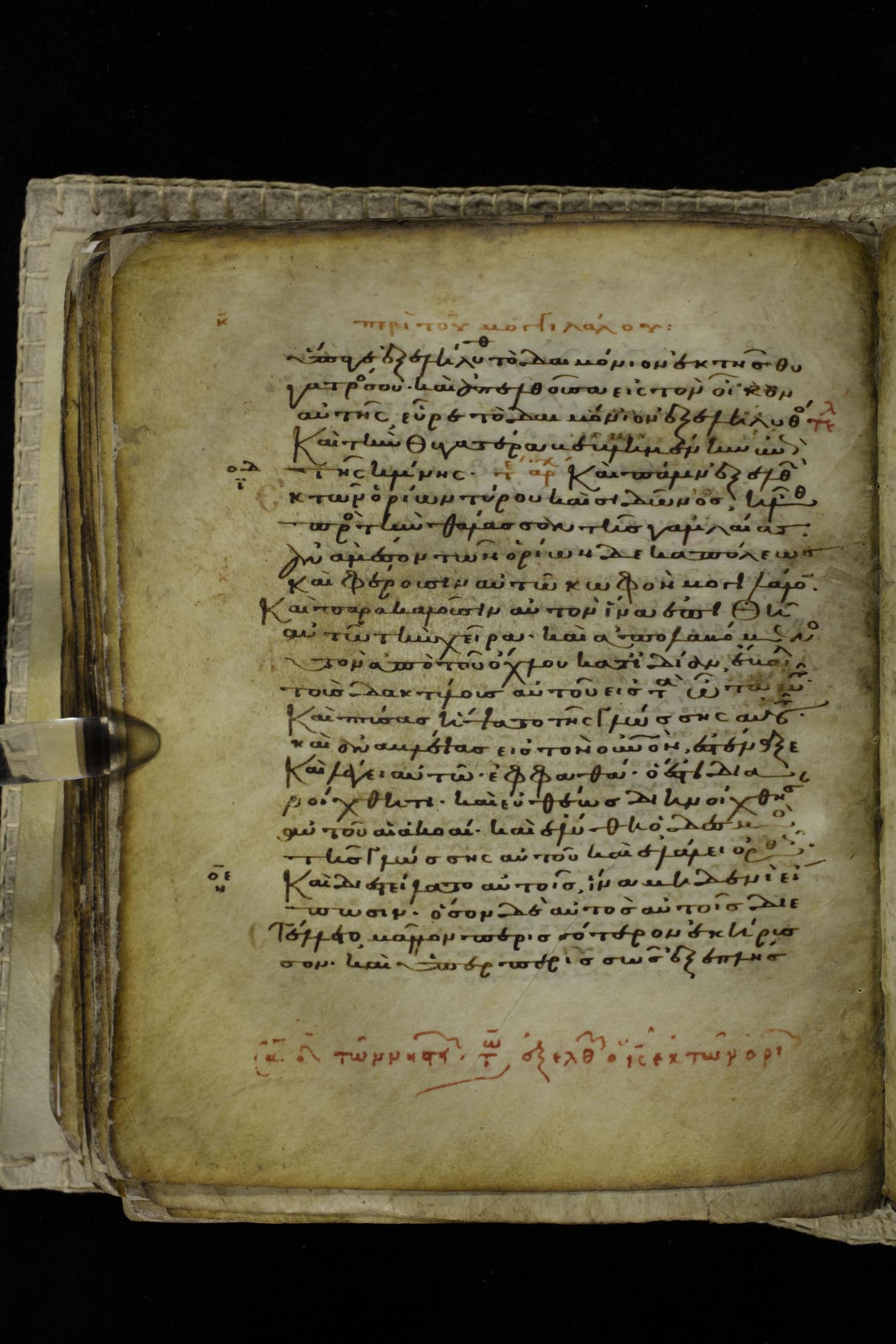 Eleventh century minuscule of the Gospels on parchment; 262 leaves, single column, 22-23 lines per column. Images were taken at the Hellenic Parliament Library in Athens.