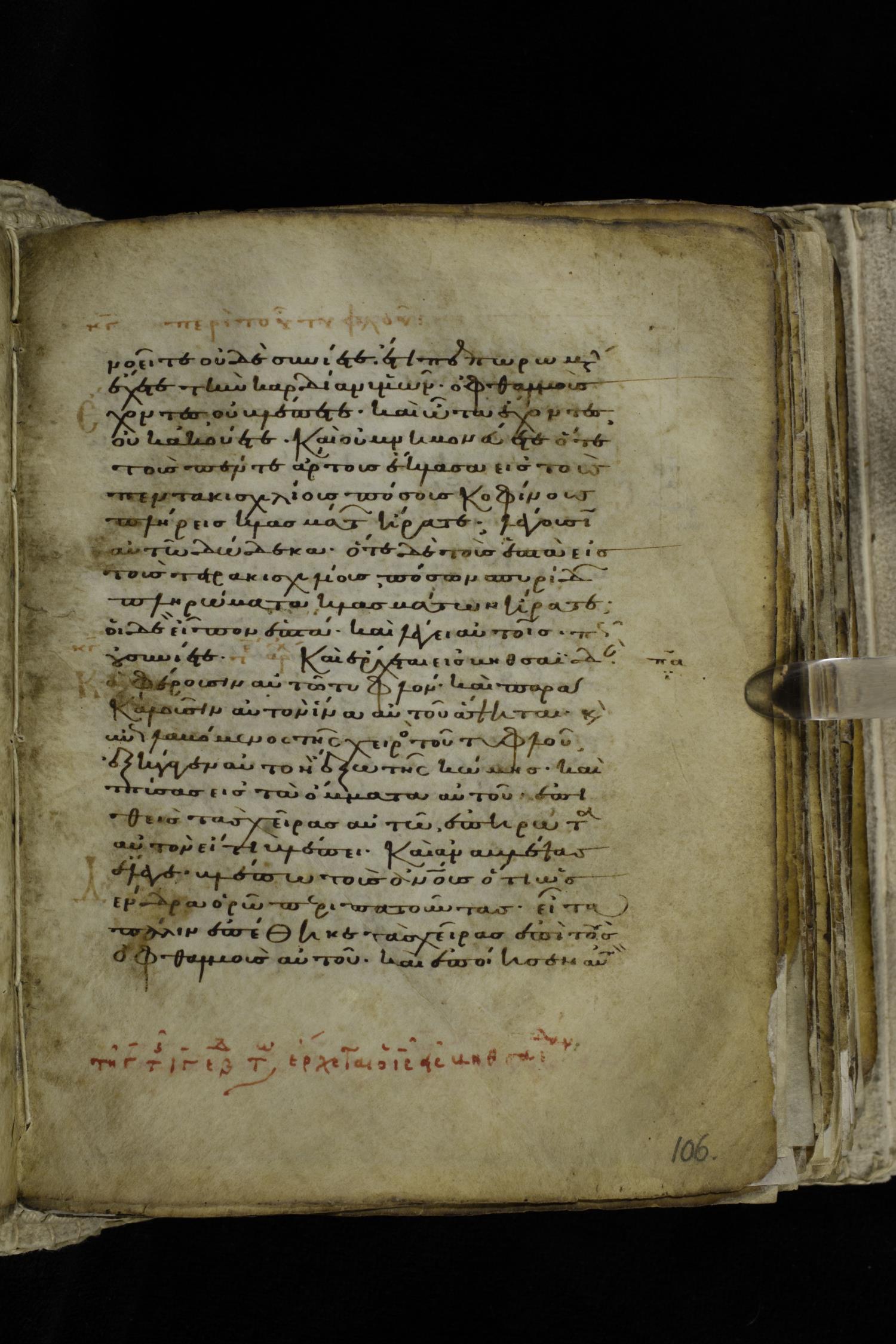 Eleventh century minuscule of the Gospels on parchment; 262 leaves, single column, 22-23 lines per column. Images were taken at the Hellenic Parliament Library in Athens.