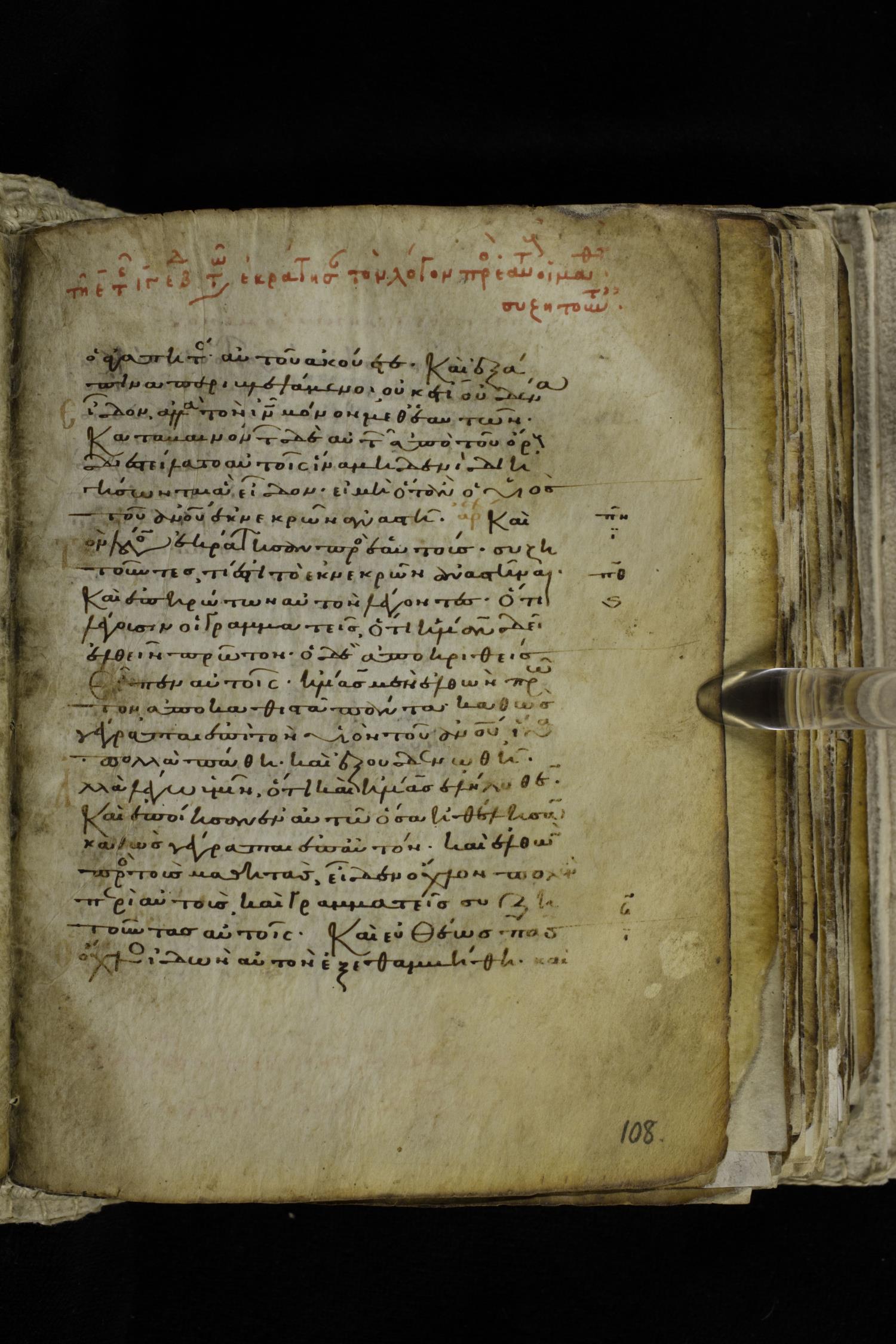 Eleventh century minuscule of the Gospels on parchment; 262 leaves, single column, 22-23 lines per column. Images were taken at the Hellenic Parliament Library in Athens.