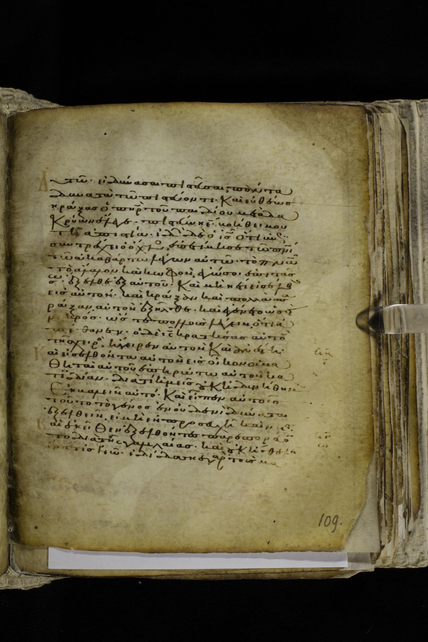 Eleventh century minuscule of the Gospels on parchment; 262 leaves, single column, 22-23 lines per column. Images were taken at the Hellenic Parliament Library in Athens.