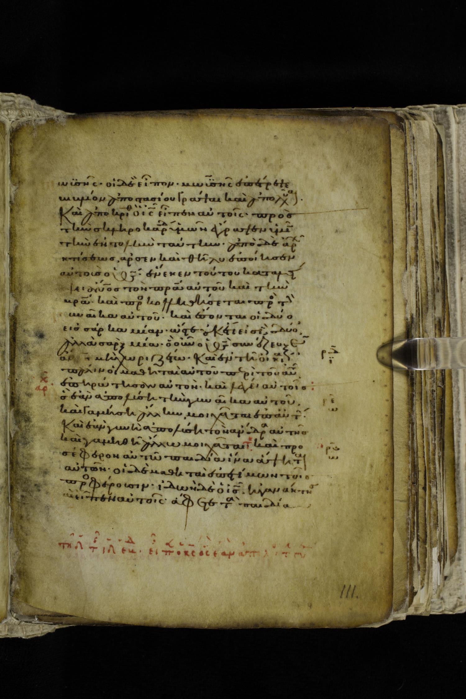 Eleventh century minuscule of the Gospels on parchment; 262 leaves, single column, 22-23 lines per column. Images were taken at the Hellenic Parliament Library in Athens.