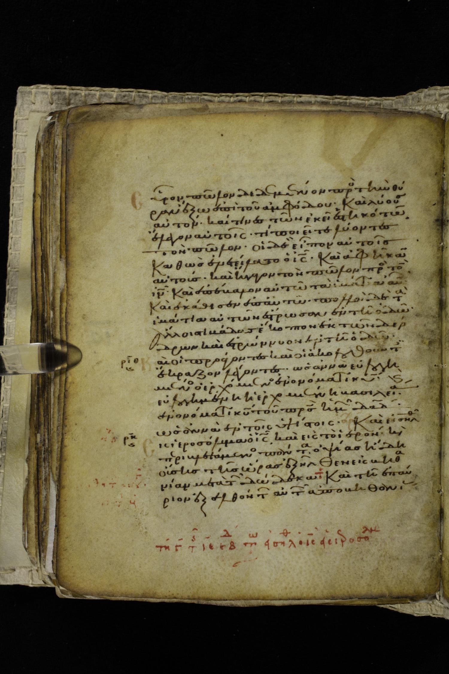 Eleventh century minuscule of the Gospels on parchment; 262 leaves, single column, 22-23 lines per column. Images were taken at the Hellenic Parliament Library in Athens.