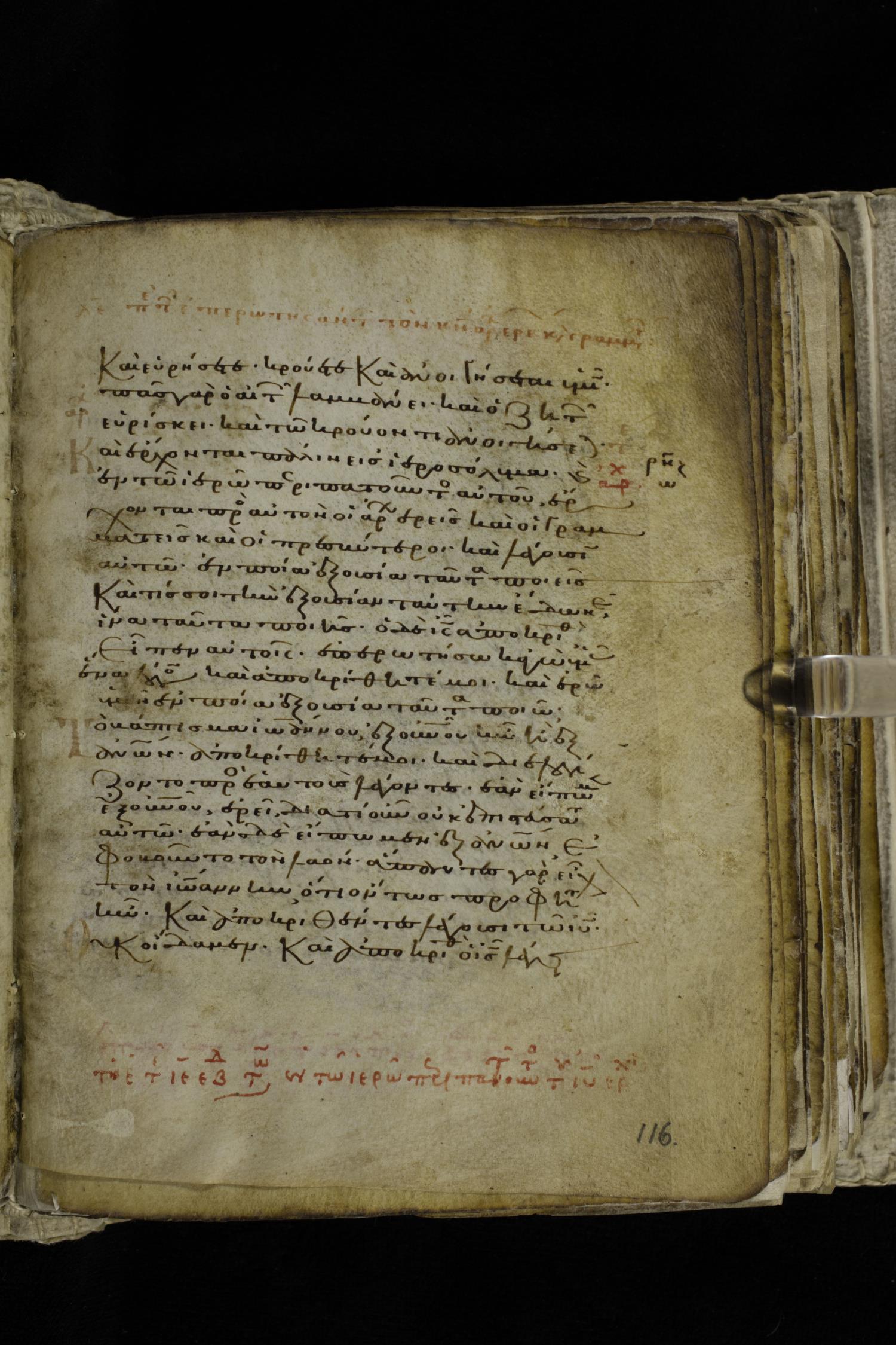 Eleventh century minuscule of the Gospels on parchment; 262 leaves, single column, 22-23 lines per column. Images were taken at the Hellenic Parliament Library in Athens.