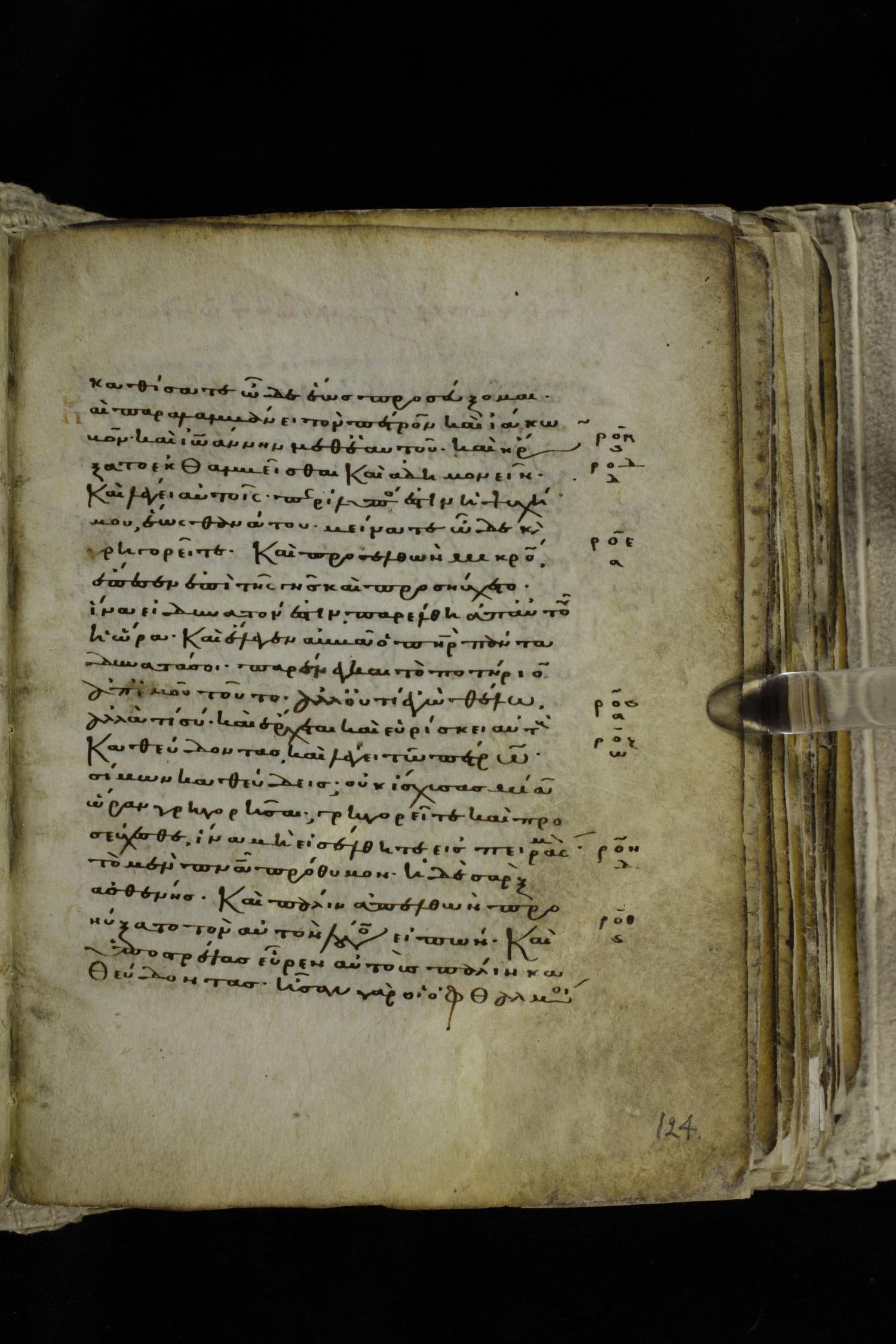 Eleventh century minuscule of the Gospels on parchment; 262 leaves, single column, 22-23 lines per column. Images were taken at the Hellenic Parliament Library in Athens.