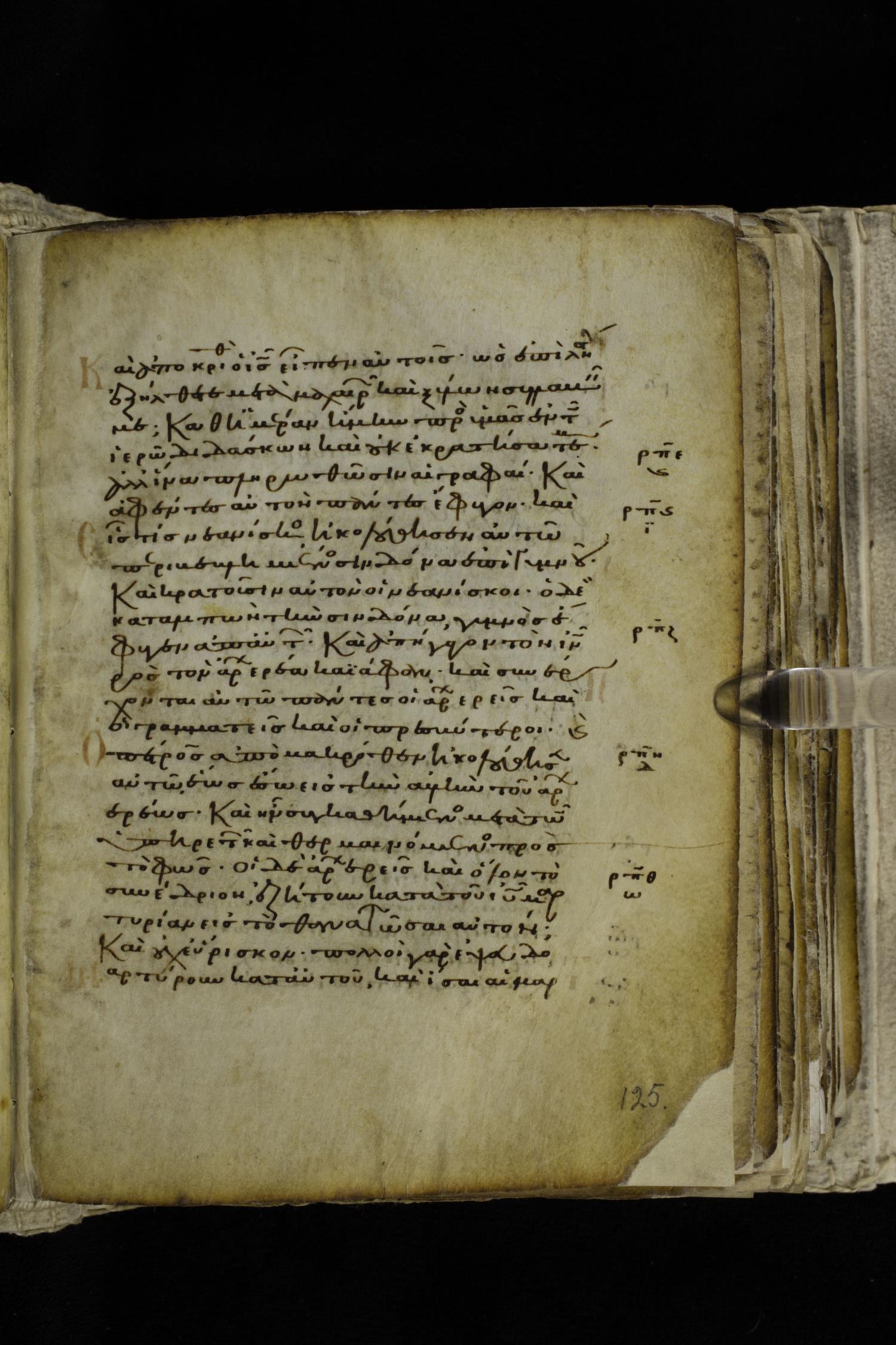 Eleventh century minuscule of the Gospels on parchment; 262 leaves, single column, 22-23 lines per column. Images were taken at the Hellenic Parliament Library in Athens.