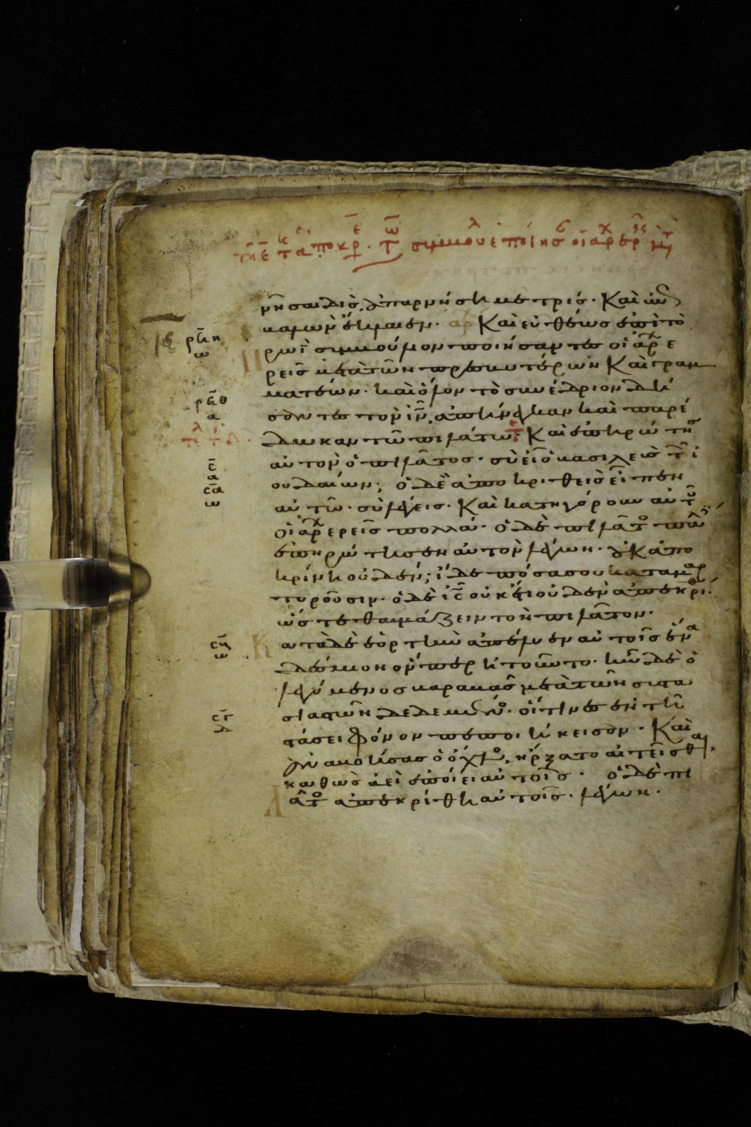 Eleventh century minuscule of the Gospels on parchment; 262 leaves, single column, 22-23 lines per column. Images were taken at the Hellenic Parliament Library in Athens.