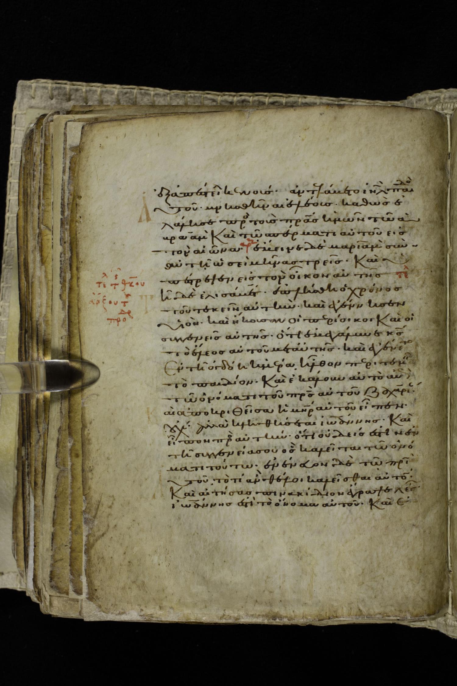 Eleventh century minuscule of the Gospels on parchment; 262 leaves, single column, 22-23 lines per column. Images were taken at the Hellenic Parliament Library in Athens.