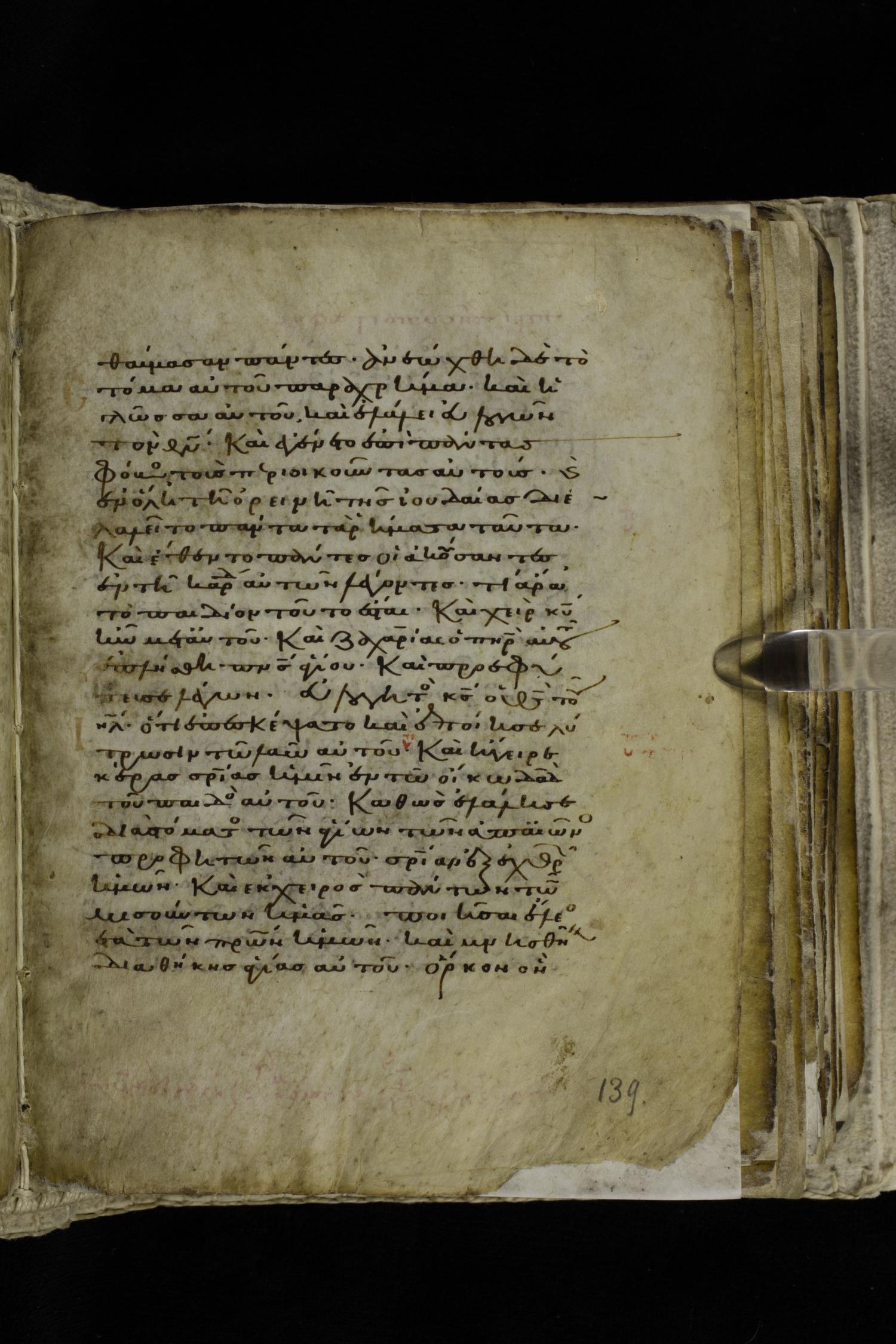 Eleventh century minuscule of the Gospels on parchment; 262 leaves, single column, 22-23 lines per column. Images were taken at the Hellenic Parliament Library in Athens.