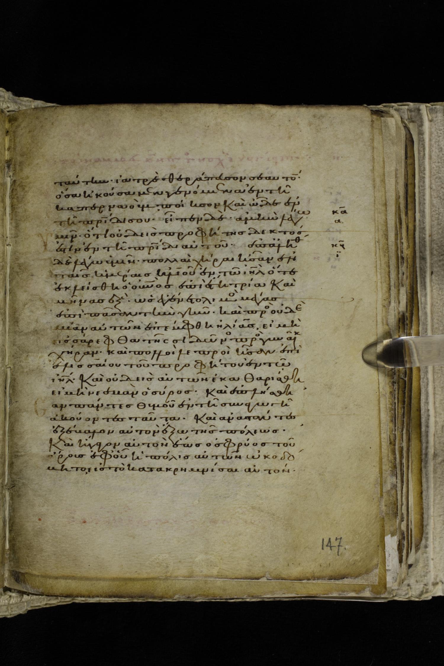 Eleventh century minuscule of the Gospels on parchment; 262 leaves, single column, 22-23 lines per column. Images were taken at the Hellenic Parliament Library in Athens.