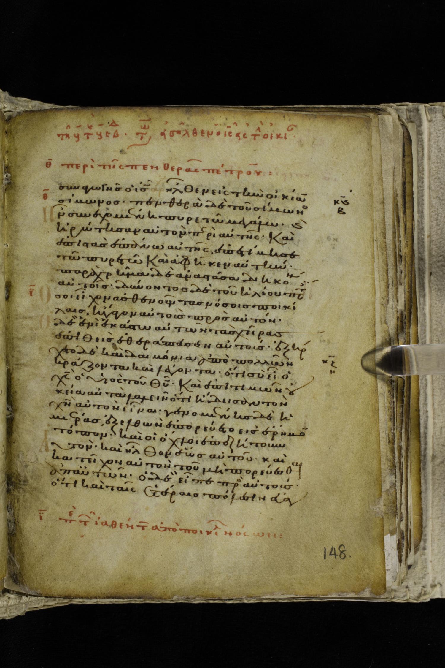 Eleventh century minuscule of the Gospels on parchment; 262 leaves, single column, 22-23 lines per column. Images were taken at the Hellenic Parliament Library in Athens.