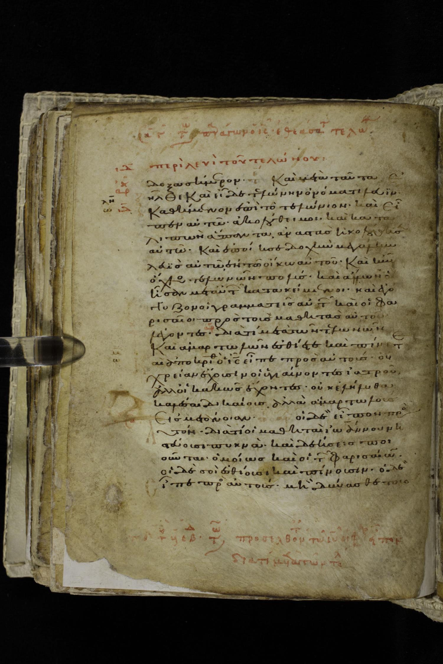 Eleventh century minuscule of the Gospels on parchment; 262 leaves, single column, 22-23 lines per column. Images were taken at the Hellenic Parliament Library in Athens.