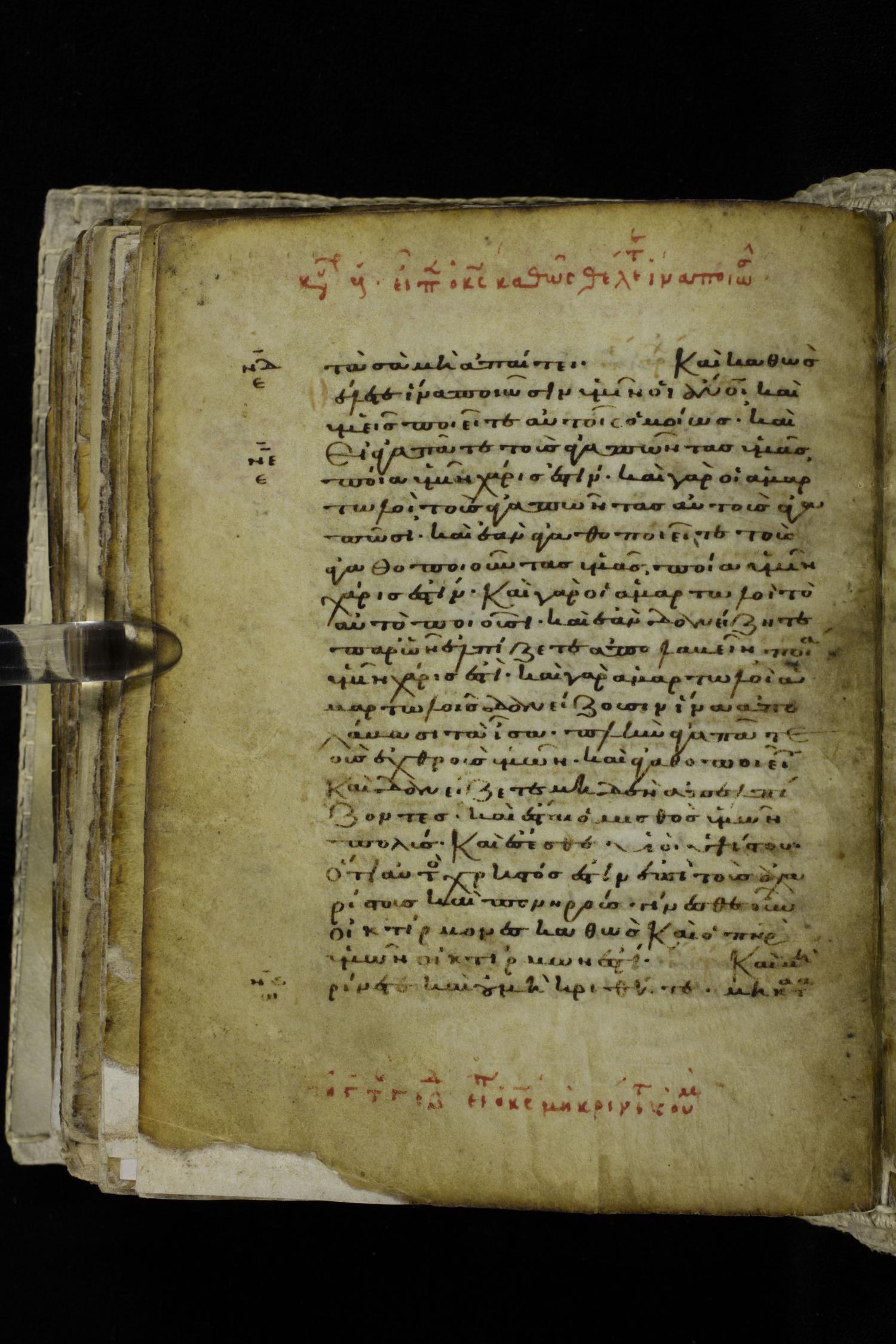 Eleventh century minuscule of the Gospels on parchment; 262 leaves, single column, 22-23 lines per column. Images were taken at the Hellenic Parliament Library in Athens.