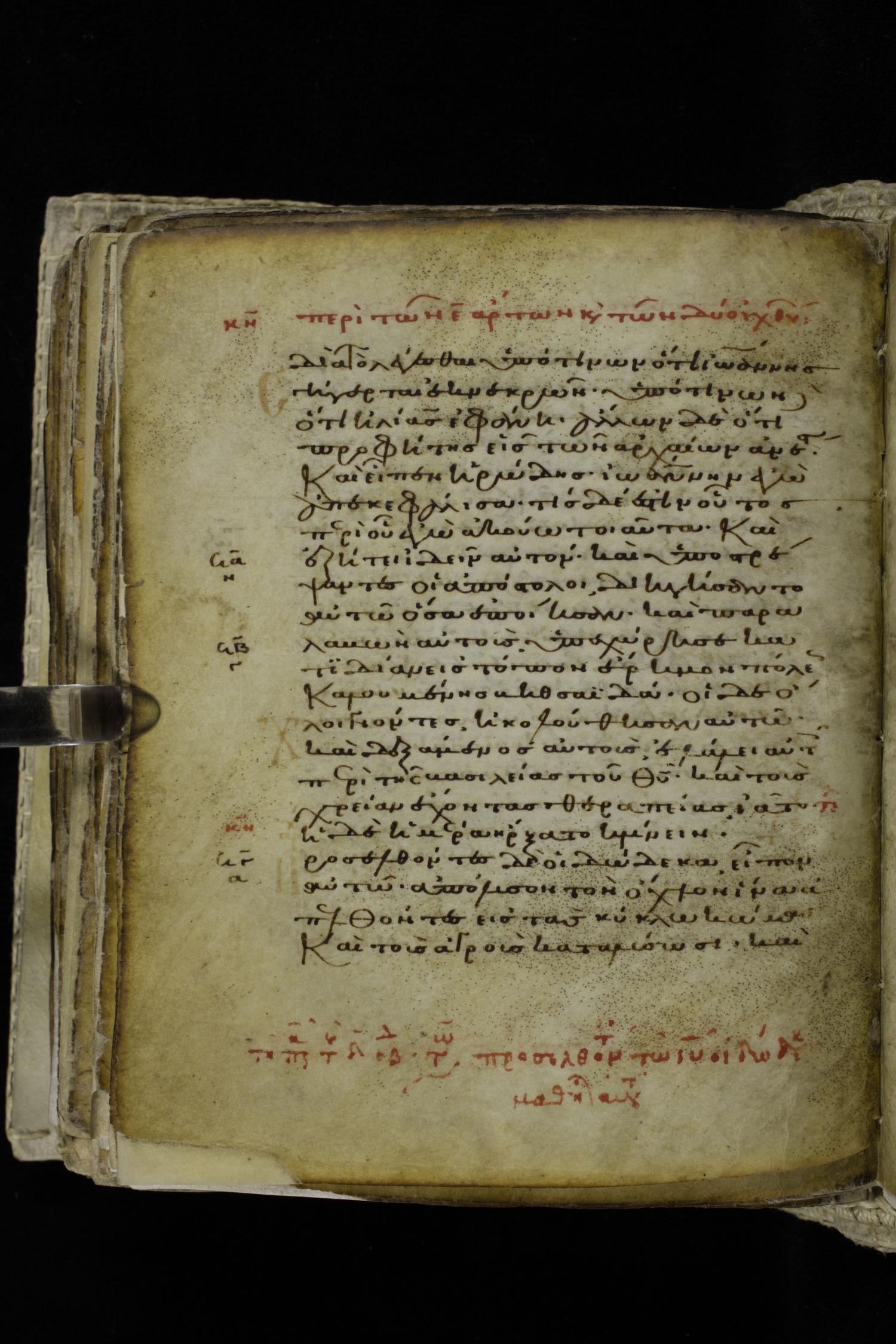 Eleventh century minuscule of the Gospels on parchment; 262 leaves, single column, 22-23 lines per column. Images were taken at the Hellenic Parliament Library in Athens.