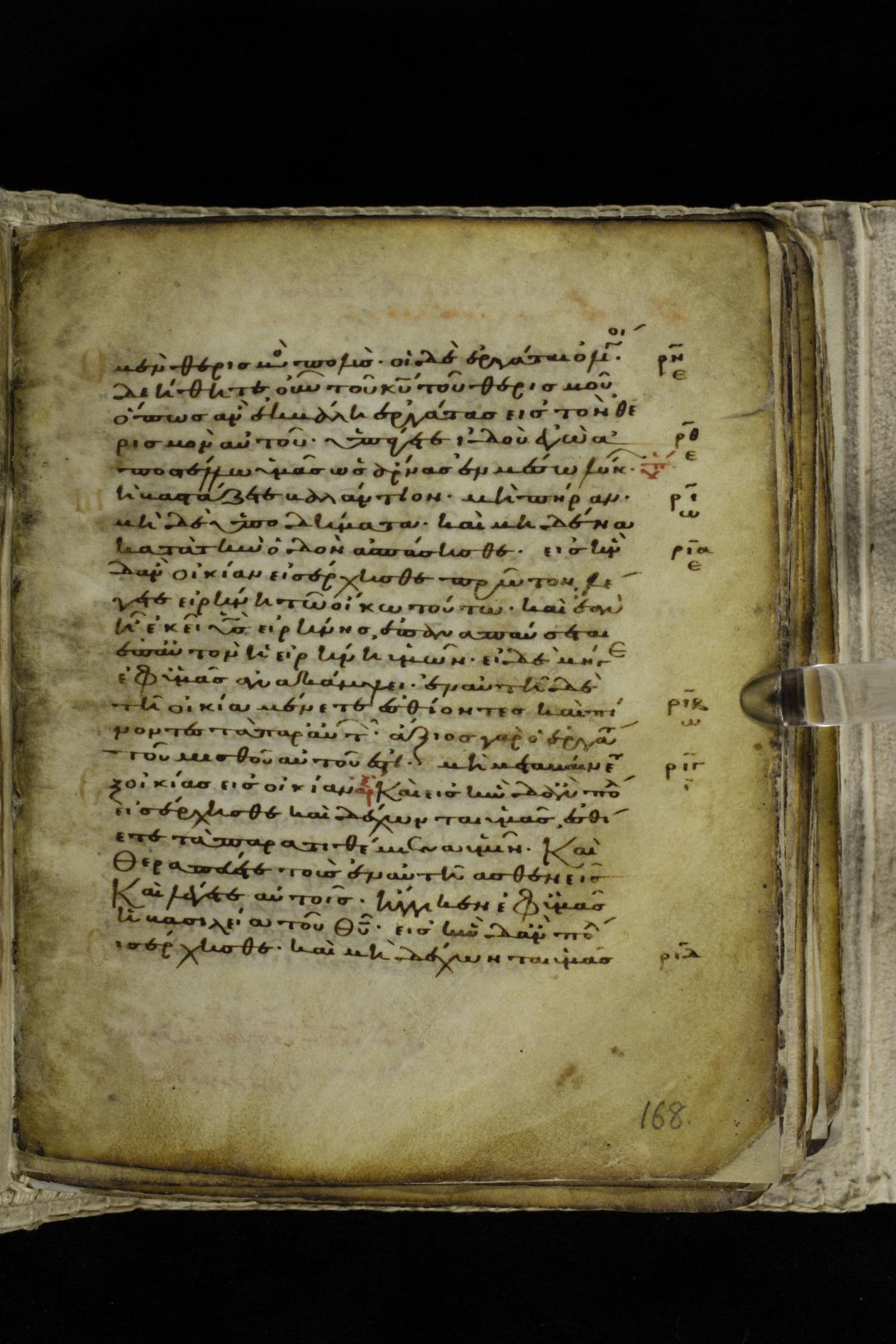 Eleventh century minuscule of the Gospels on parchment; 262 leaves, single column, 22-23 lines per column. Images were taken at the Hellenic Parliament Library in Athens.