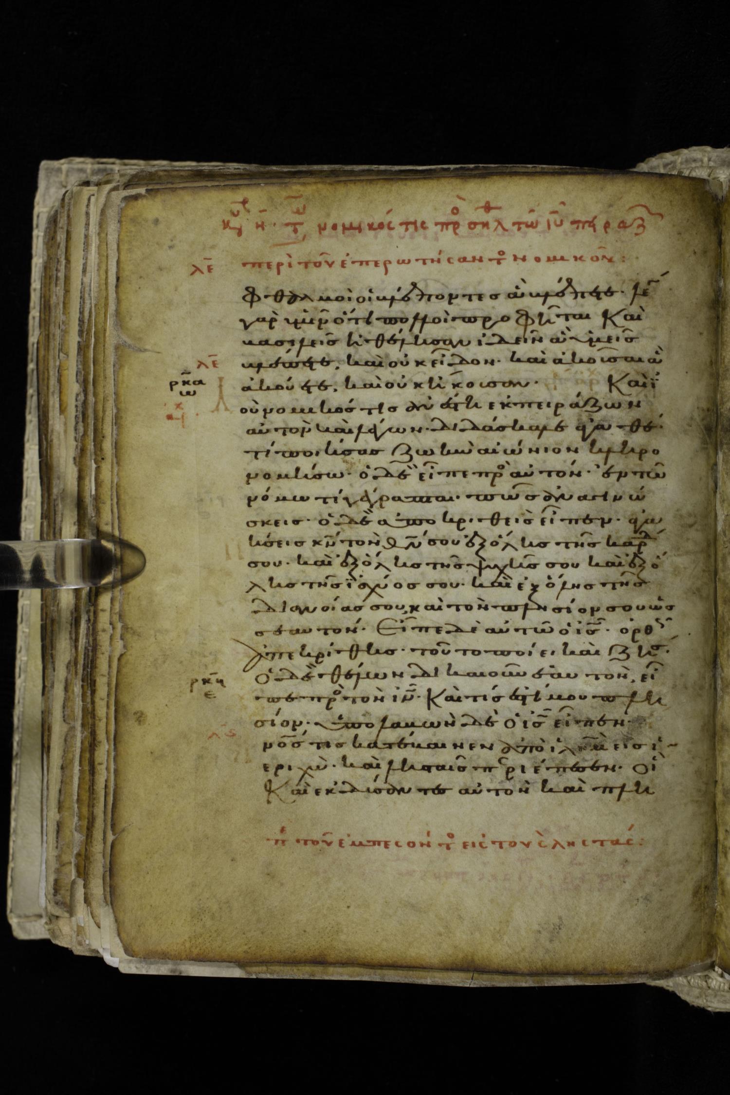 Eleventh century minuscule of the Gospels on parchment; 262 leaves, single column, 22-23 lines per column. Images were taken at the Hellenic Parliament Library in Athens.